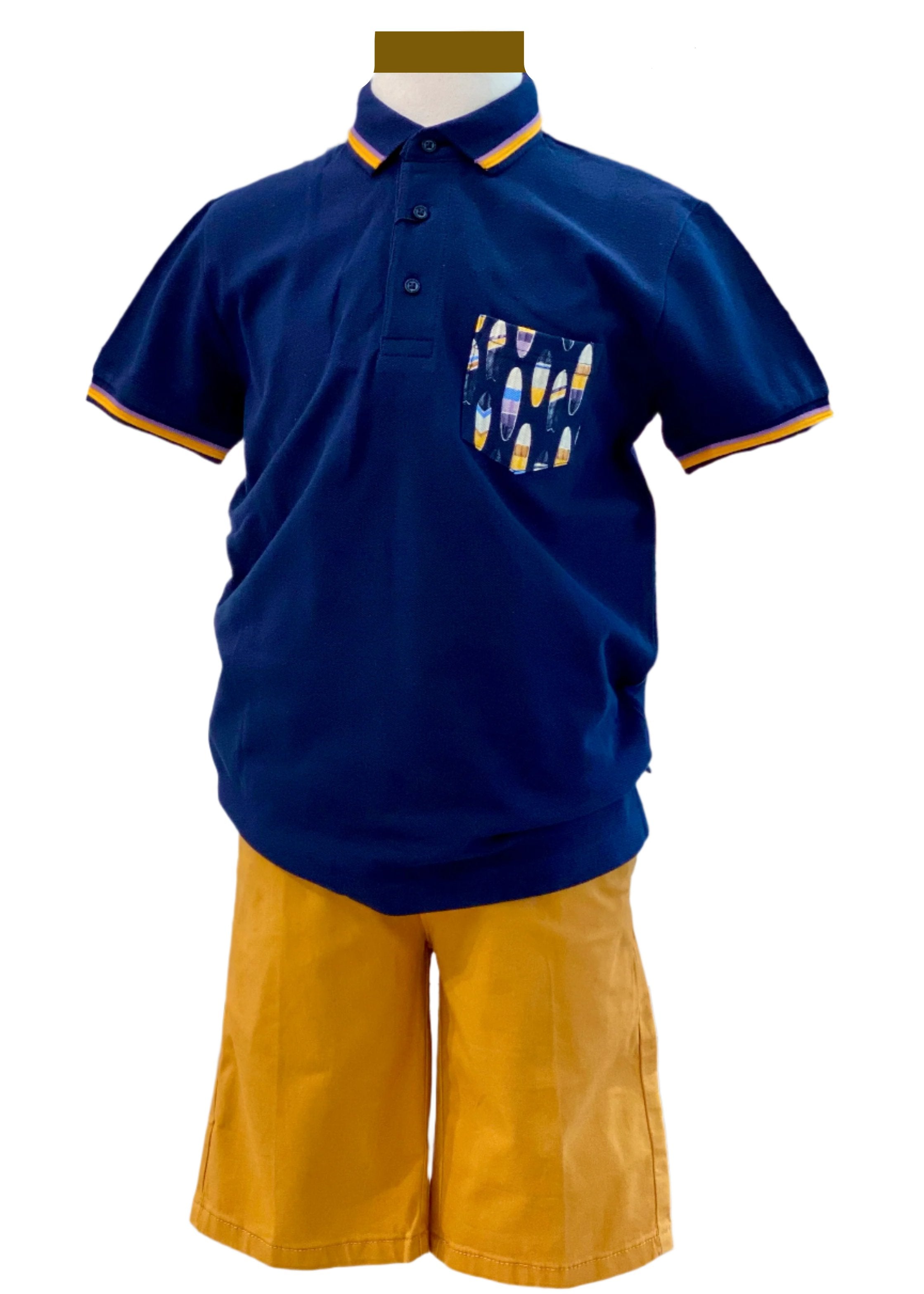 Navy blue polo shirt, made in comfortable cotton piqué. A classic smart-casual style, it has a stripe rib collar and branded button fastenings. Has a chest pocket with surf board design on front and back. Bermuda shorts has a belt loops and elasticated waistband for adjustment with four pockets. Has zipper and button fastening.