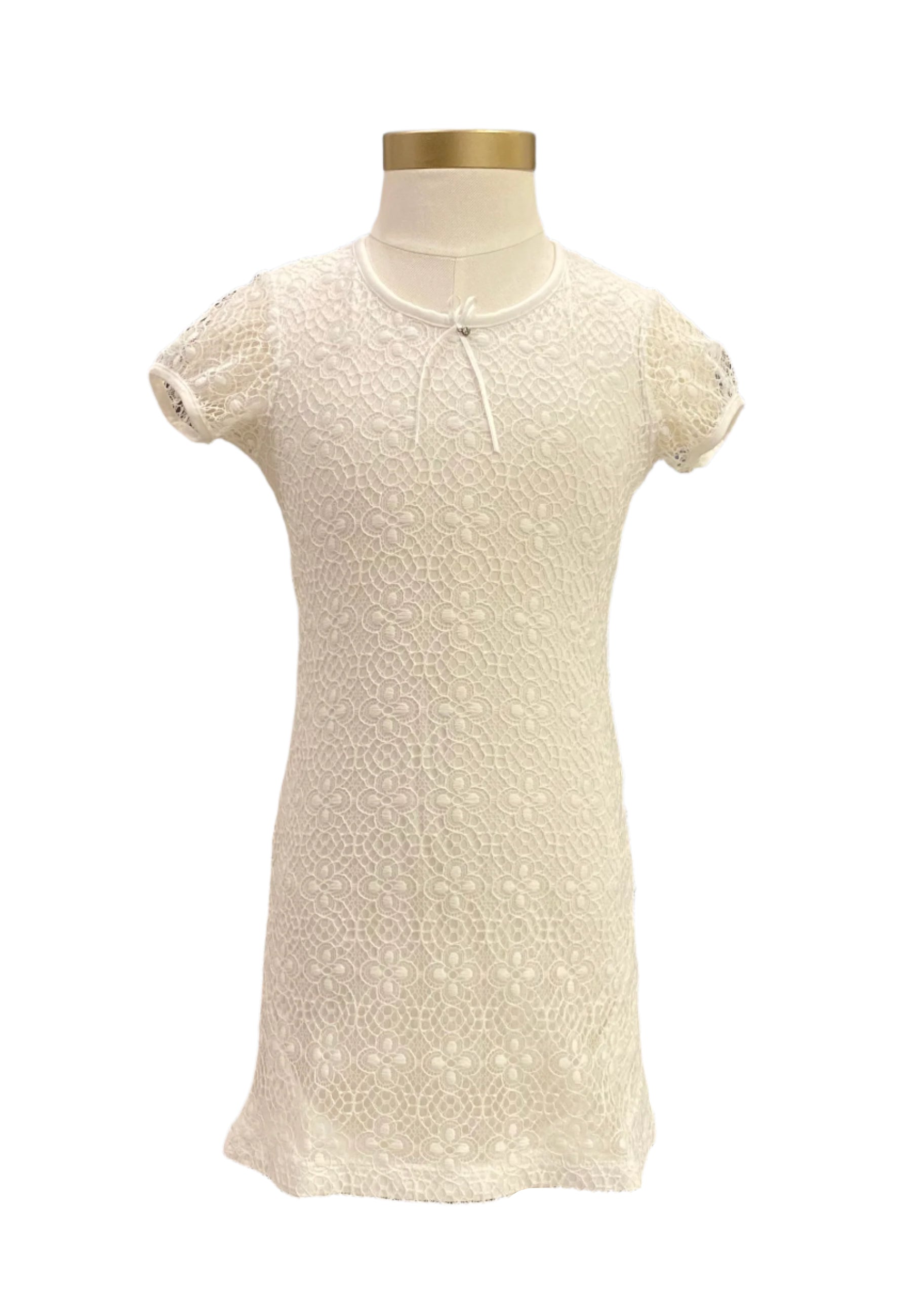 A pure white dress from La Perla, is simply designed with a flower lace and a white ribbon bow and a crystal on the neckline. An Italian brand.
