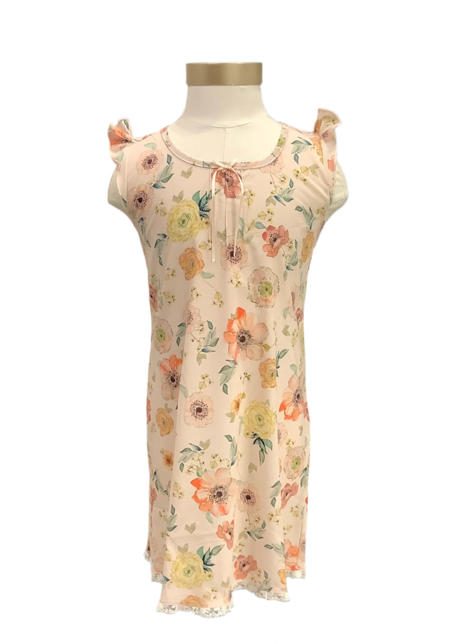 An elegant night dress from La Perla. It is all over printed with flowers. It has a small frilled sleeves, with bow, crystal and pleats design below the neckline, finished with lace on the hem.