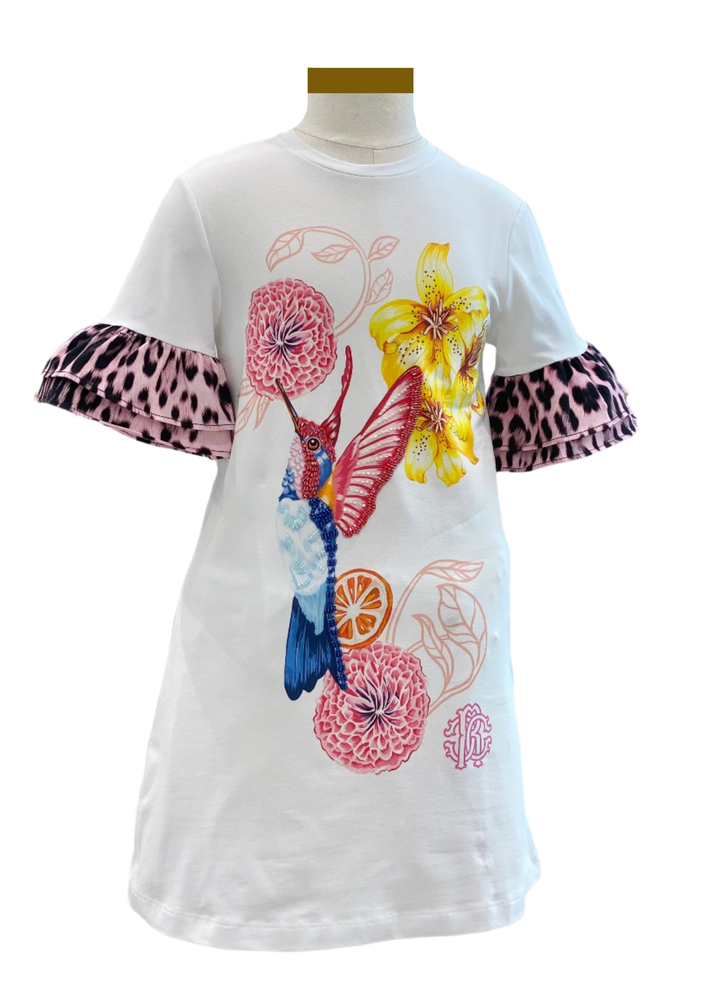 Adorable cotton dress. It has layered ruffle sleeves printed with leopard pattern. This lovely dress has bird and floral print design, finished with embellishments.