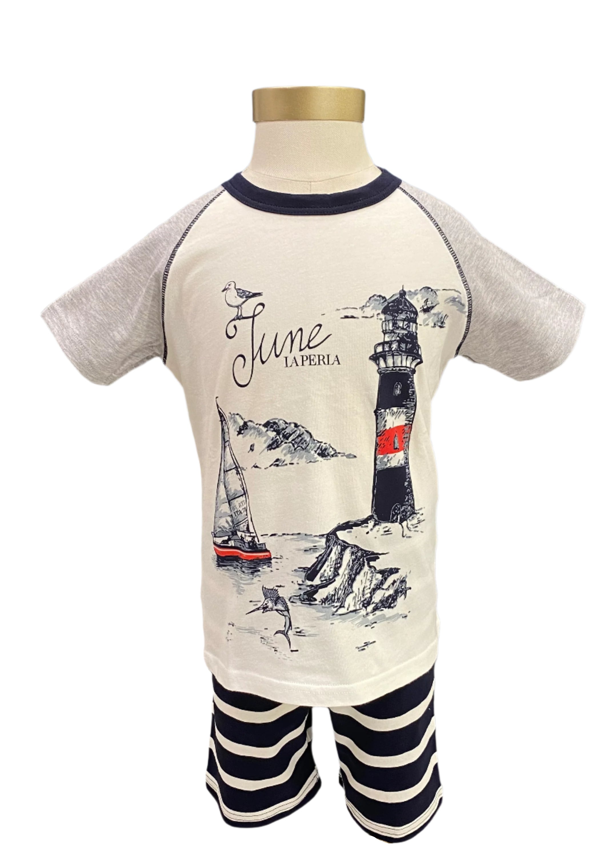 Boys navy blue, gray and white pyjamas by La Perla, made from soft cotton jersey. The short-sleeved T-shirt features boat and lighthouse print design while the stripe shorts have an elasticated waistband.