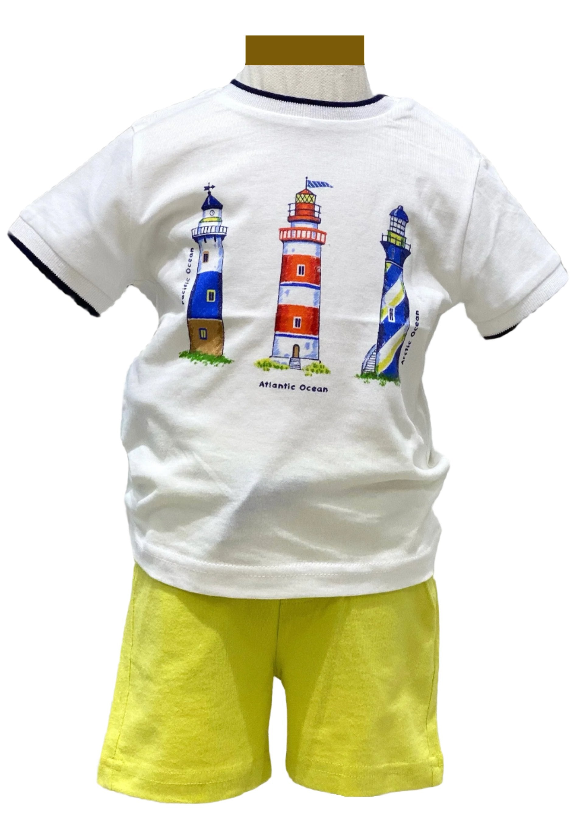 Soft and cottony short set. The top is designed with lighthouses print, elasticated sleeve hem, has snap button on left shoulder for easy wearing. The top is matched with soft short with pockets, elasticated waistband with pull string.