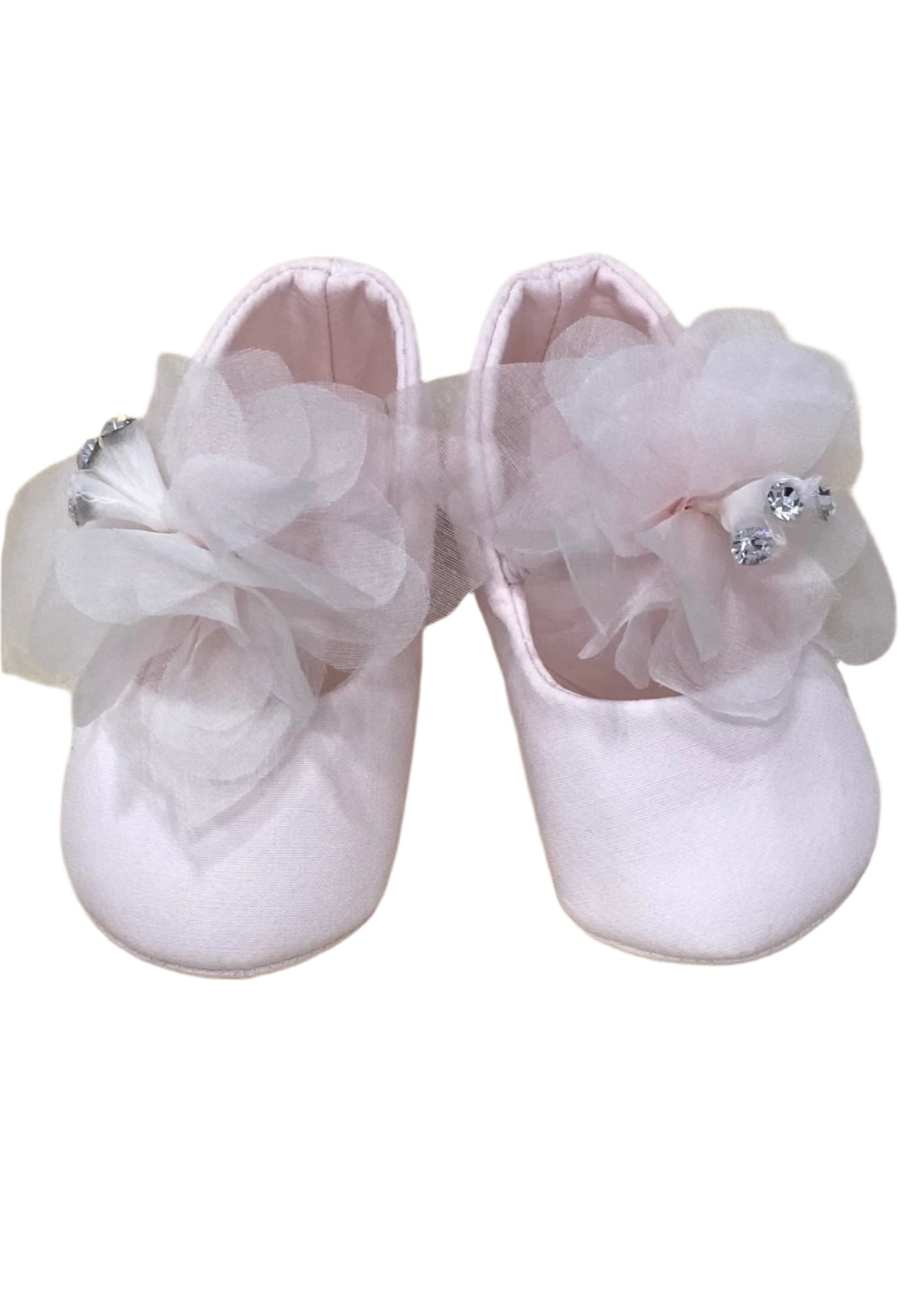Pretty flowered ballet flats in soft fabric, has two tender flowers with rhinestones on the front. Perfect for your little girls on every occasion.