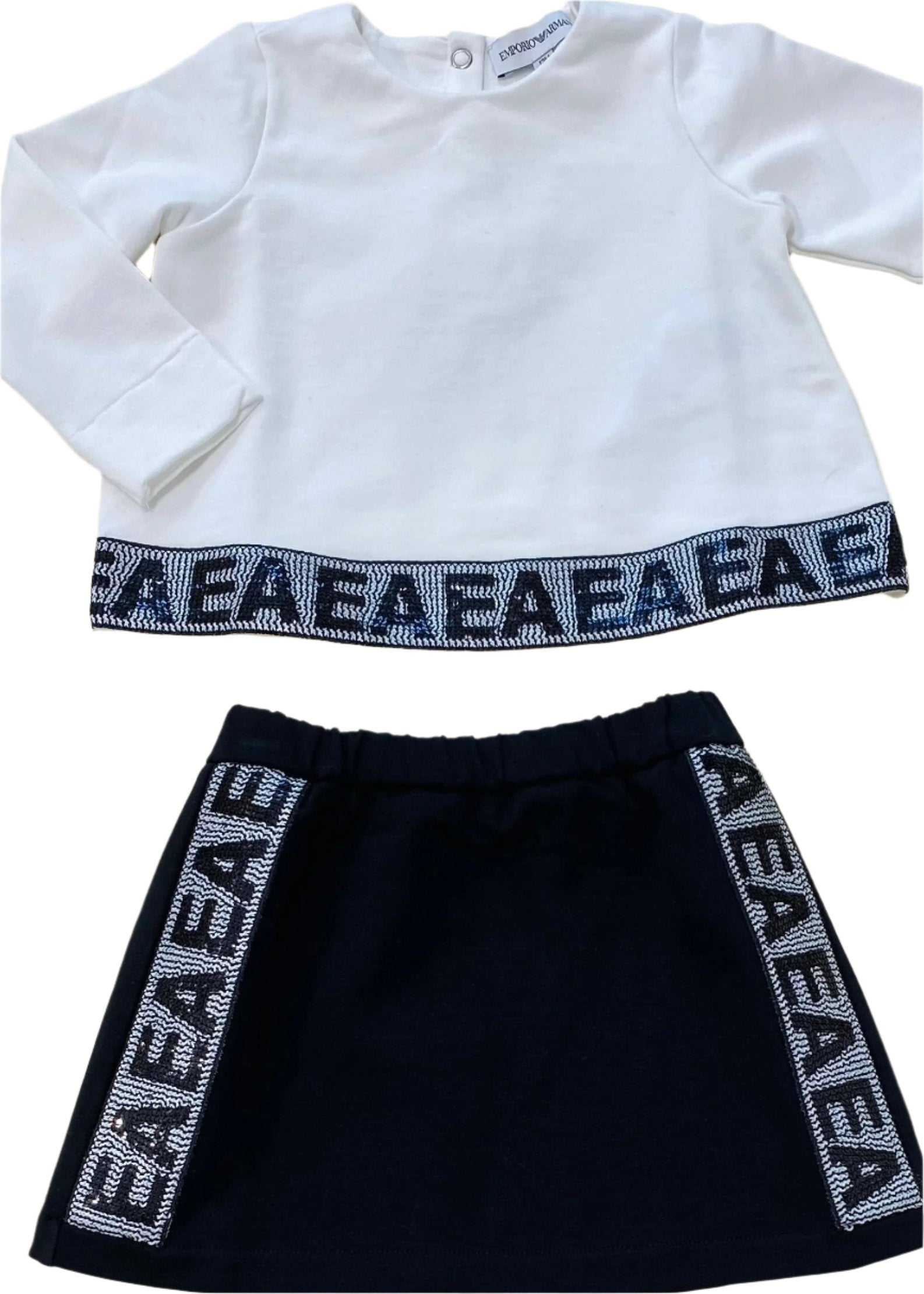 An ideal baby girl outfit set for cold weather. This set comes with a flare cut long sleeve top and skirt, both designed with 'EA' sequins on the hem.