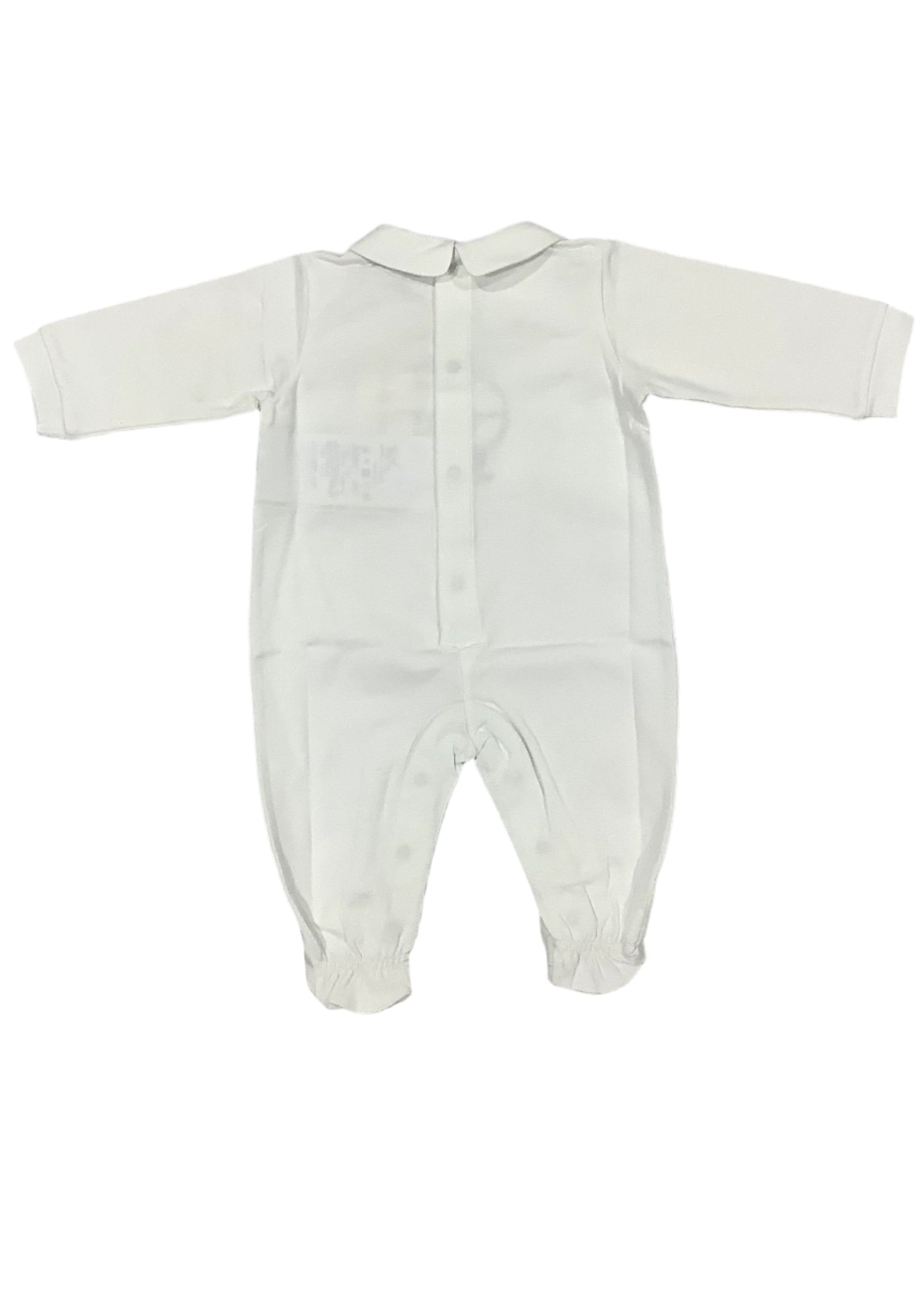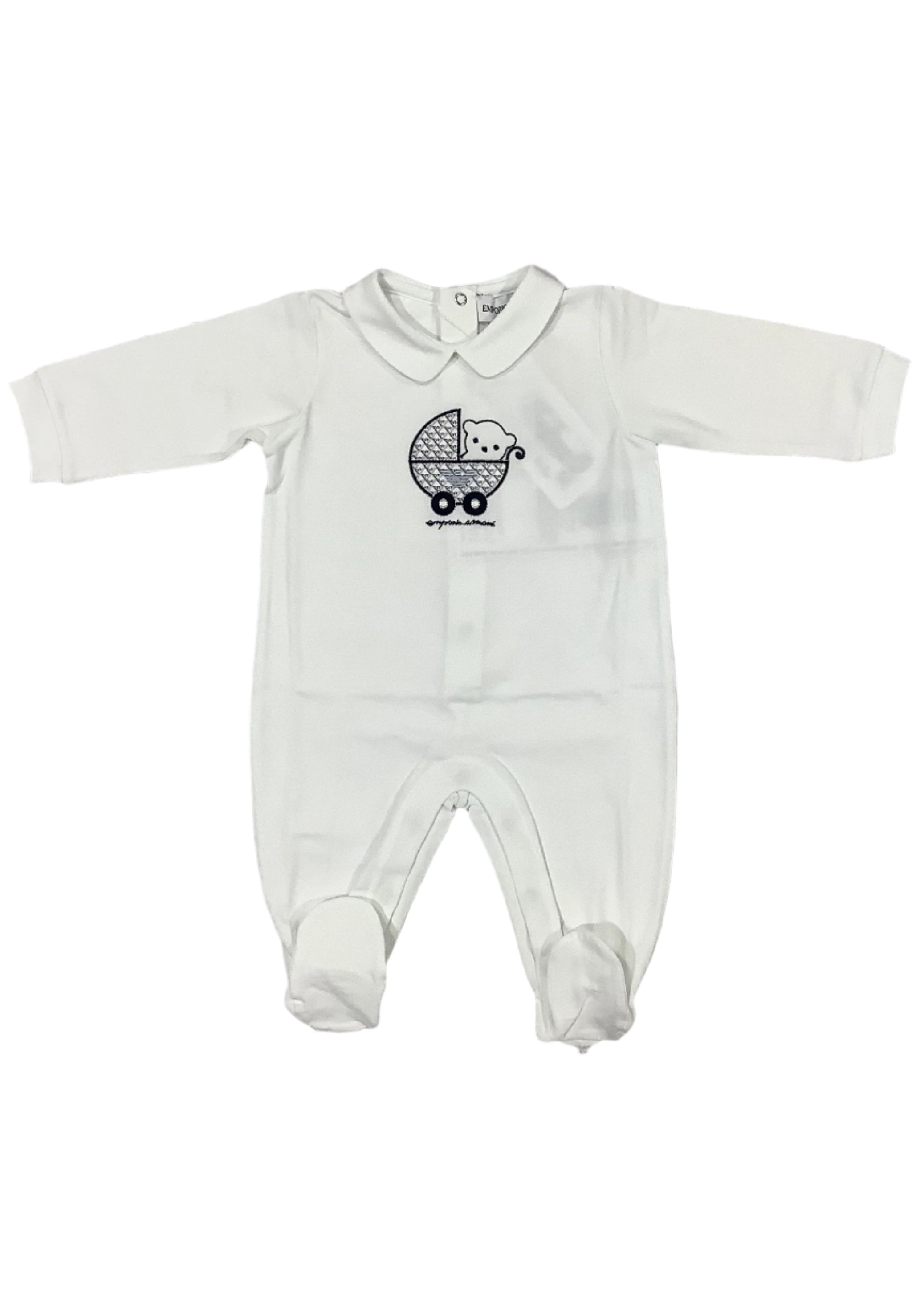 Peter pan collared romper. Embroidered with manga baby in a stroller. Has snap button fastening at the back and in between legs.