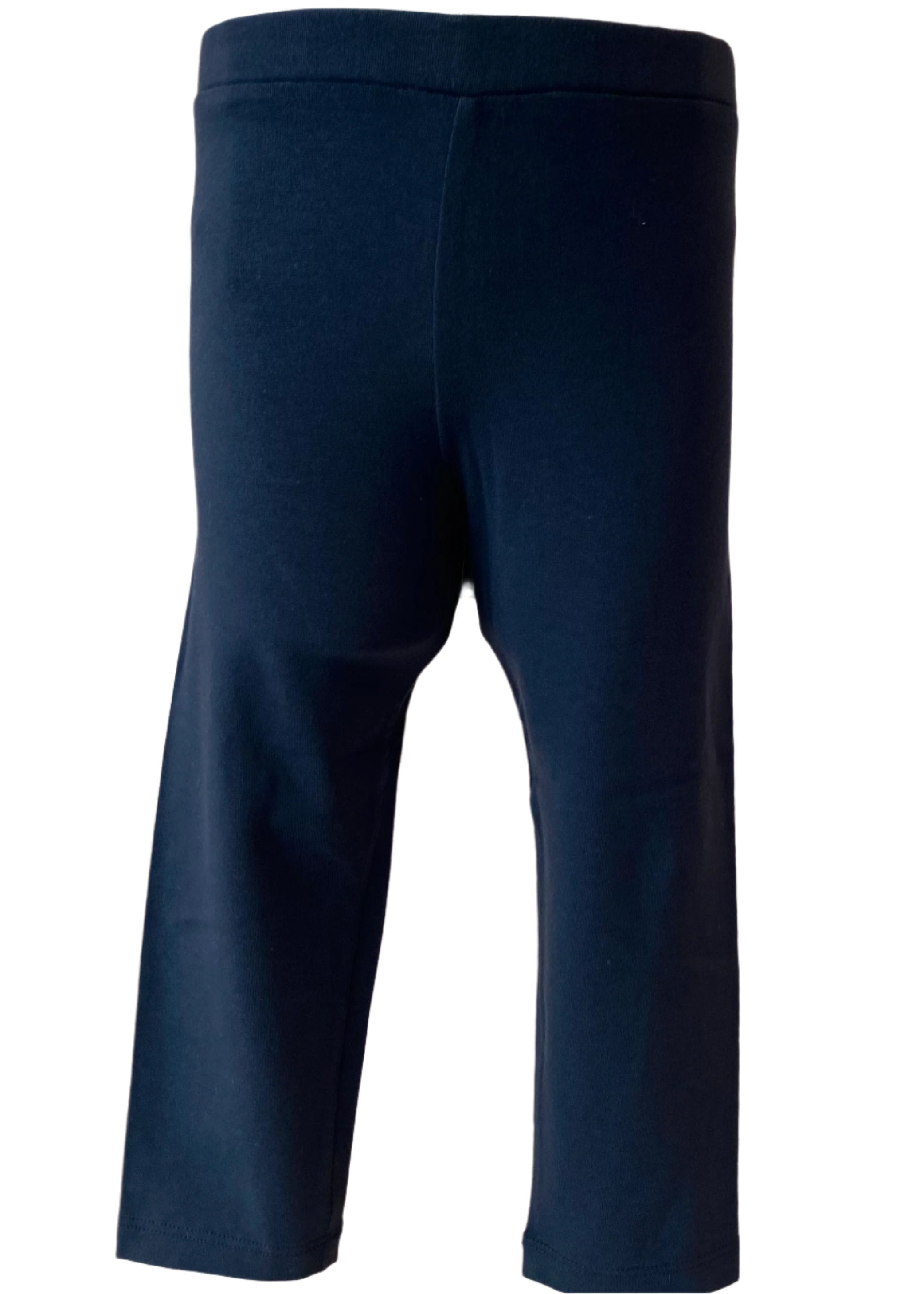 Stretchable navy-blue leggings. At the bottom of the right trouser leg, there is a gold print of a manga bear with sunglasses, "EA" and Eagle logo of gold sequins. The Emporio Armani leggings have a good elastic edge at the waist. Comfortable to wear.