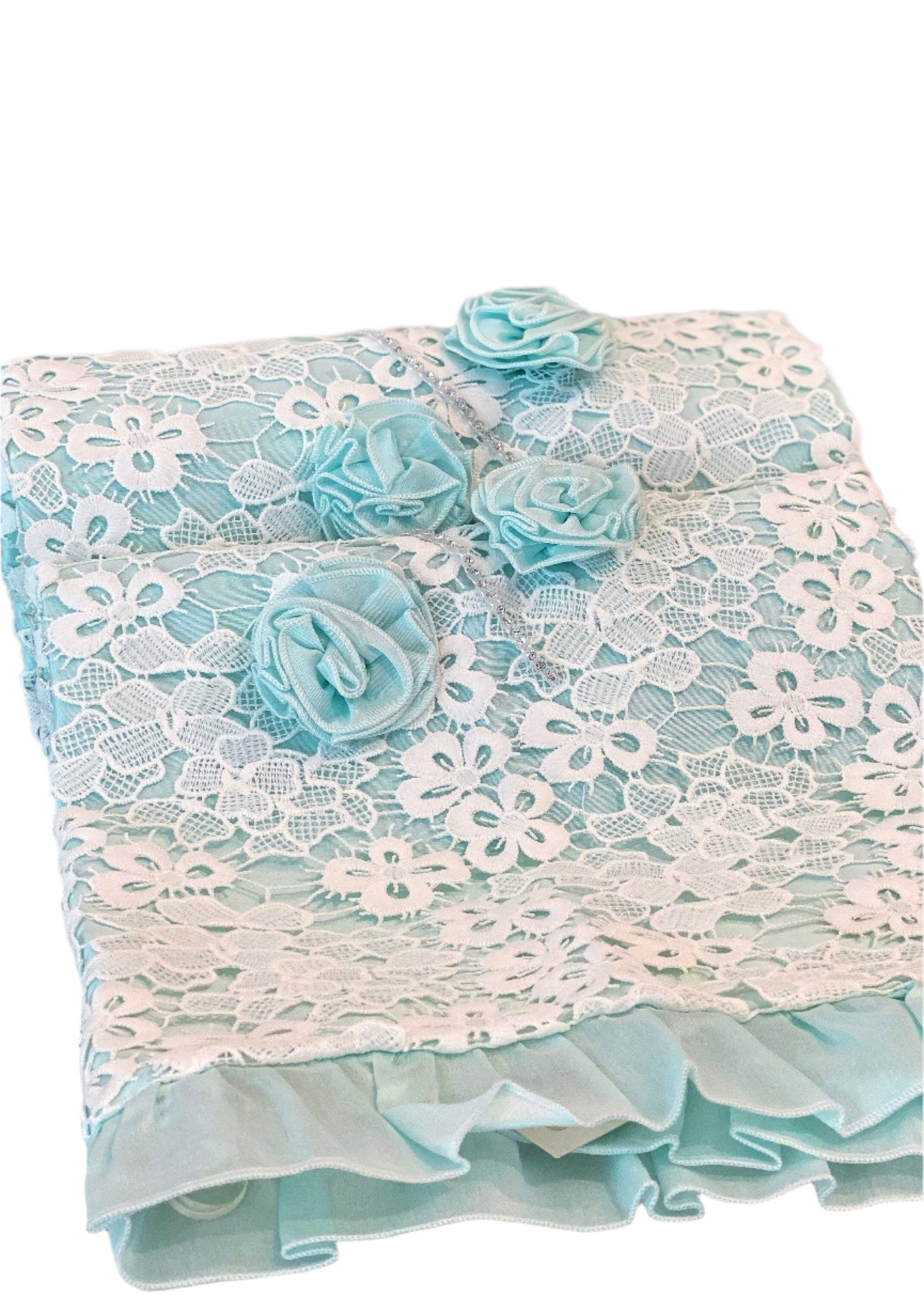 Baby Girl celebration blanket. Made of green silk and overlayed with a white cut-out lace of flowers and finished with crystals string and decorative flowers.