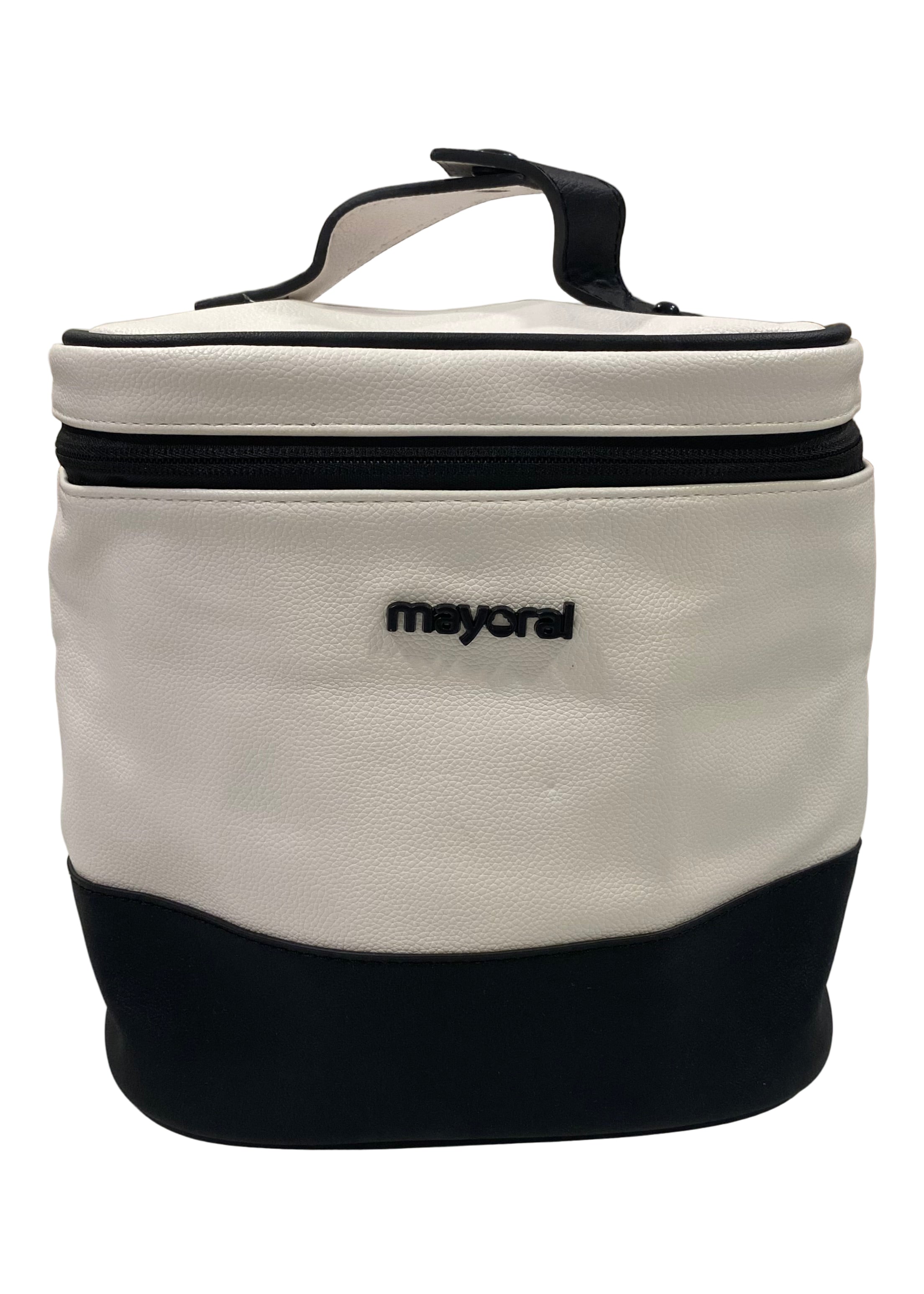 Compact cooler with interior thermal lining, allowing food and drink to be at the desired temperature. Zip fastening with short holder.
