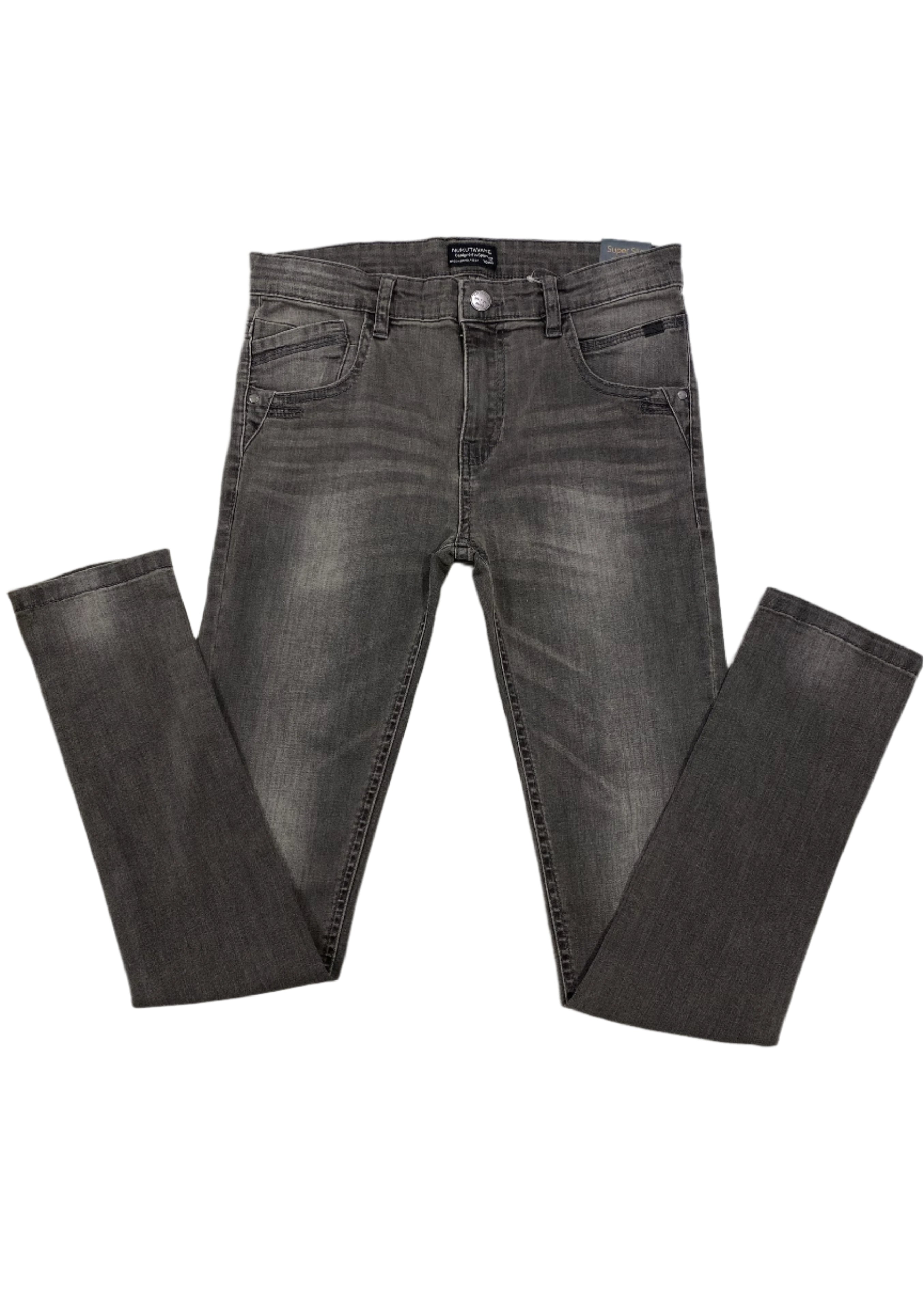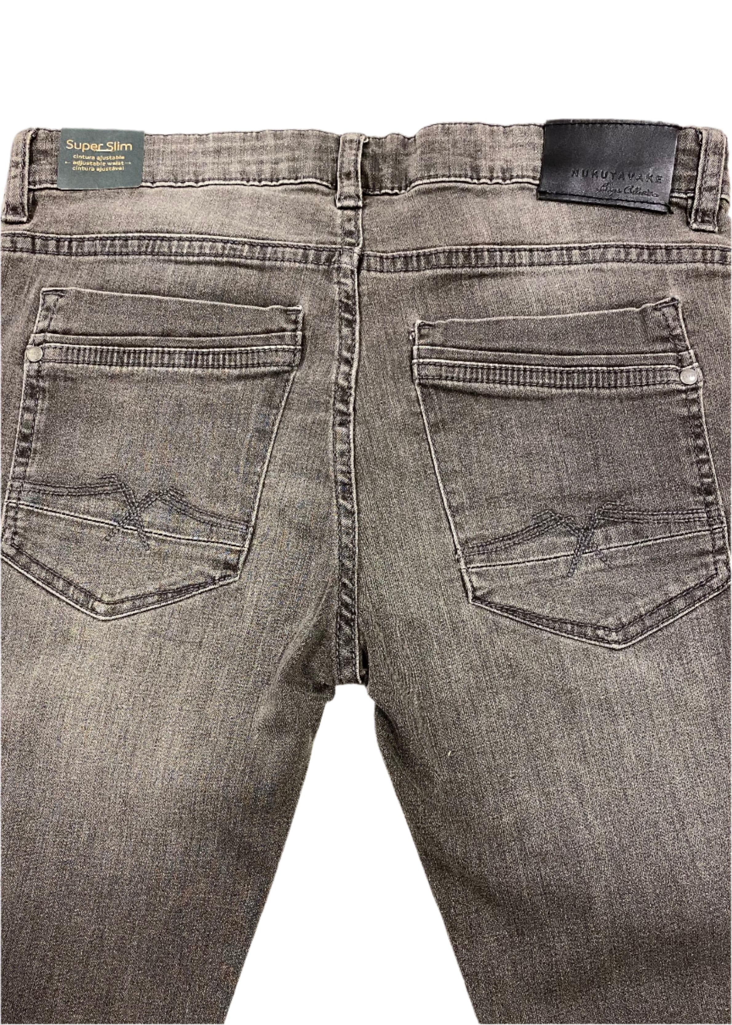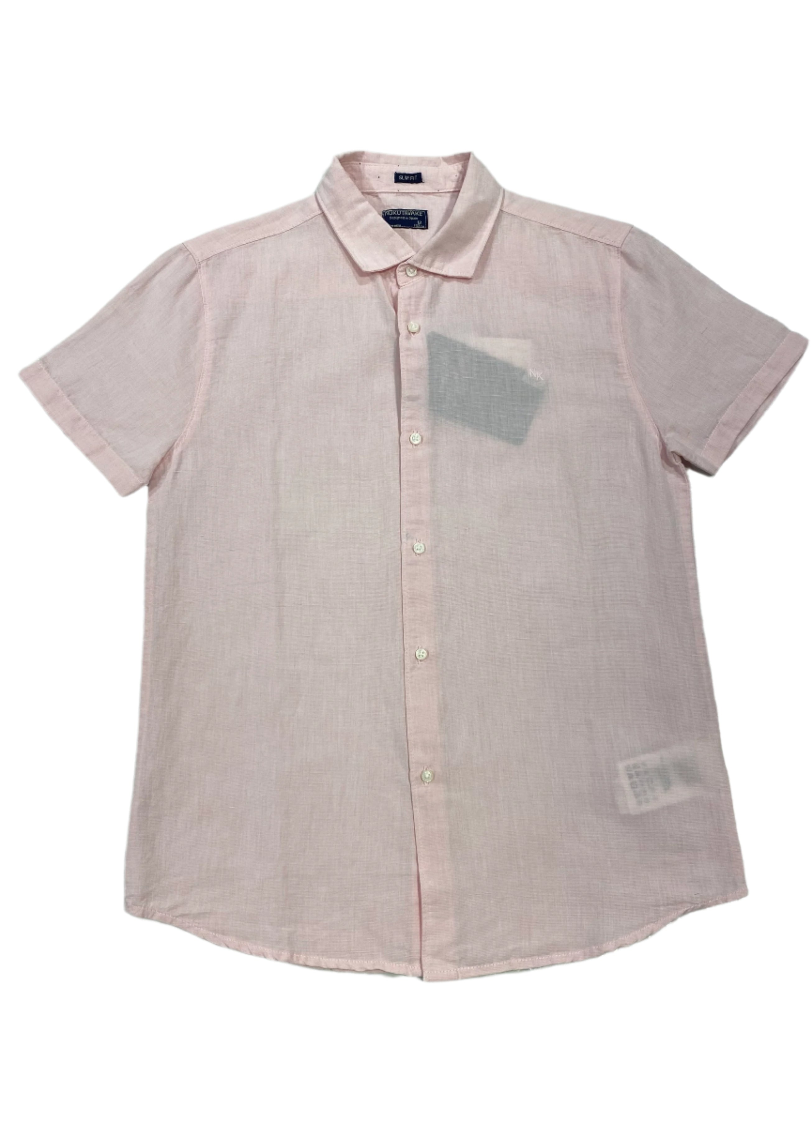 A unique color combination of boy's outfit. It comes with a stand collar short sleeves linen shirt. Top has a micro dot design in reverse of the collar. This top is matched with a long, slim cut jeans with adjustment on the waistband. A product of Mayoral