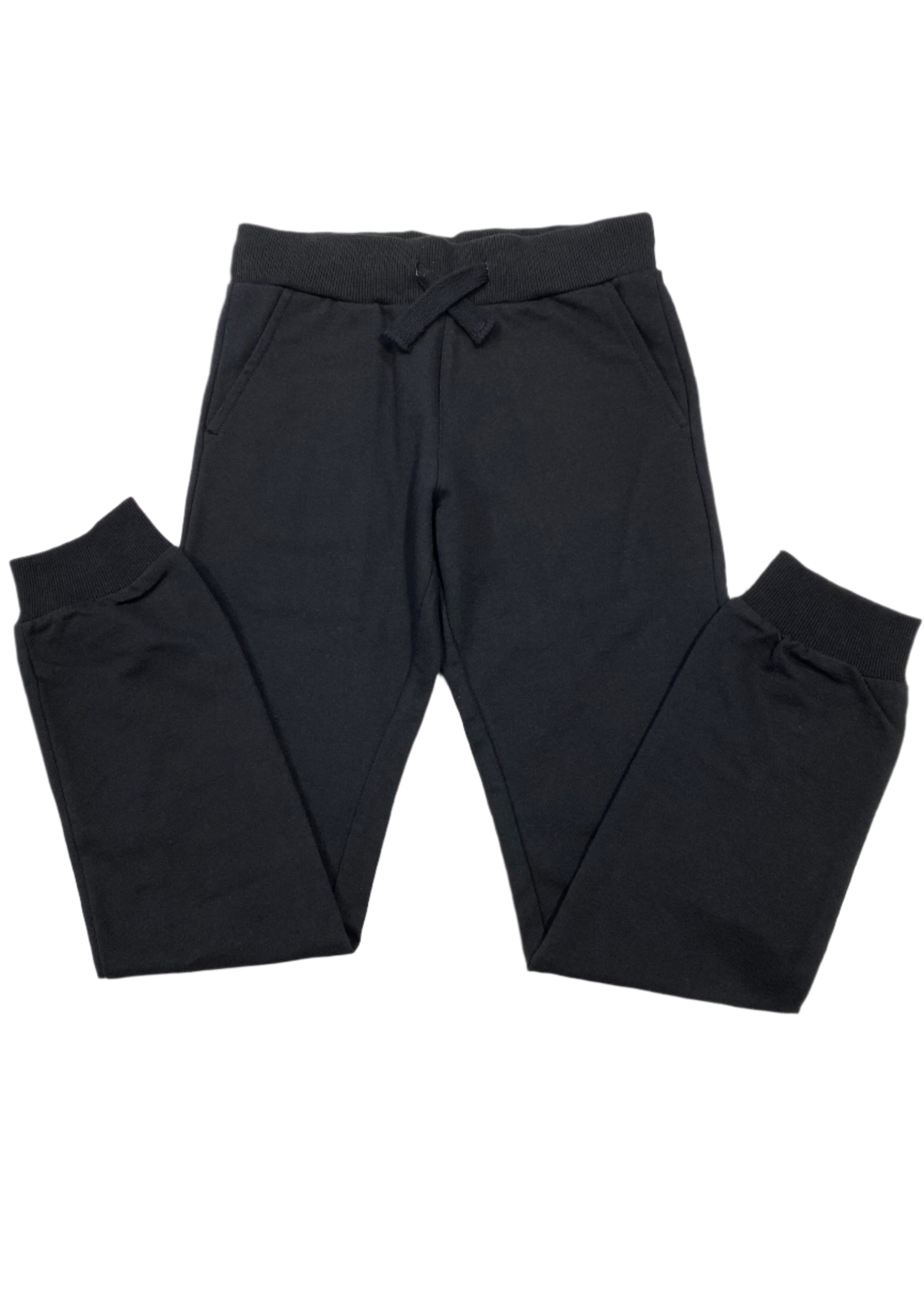 Black jogger pants. Garterized on waistband and on leg hem with pocket at the back. Comfortable to wear.
