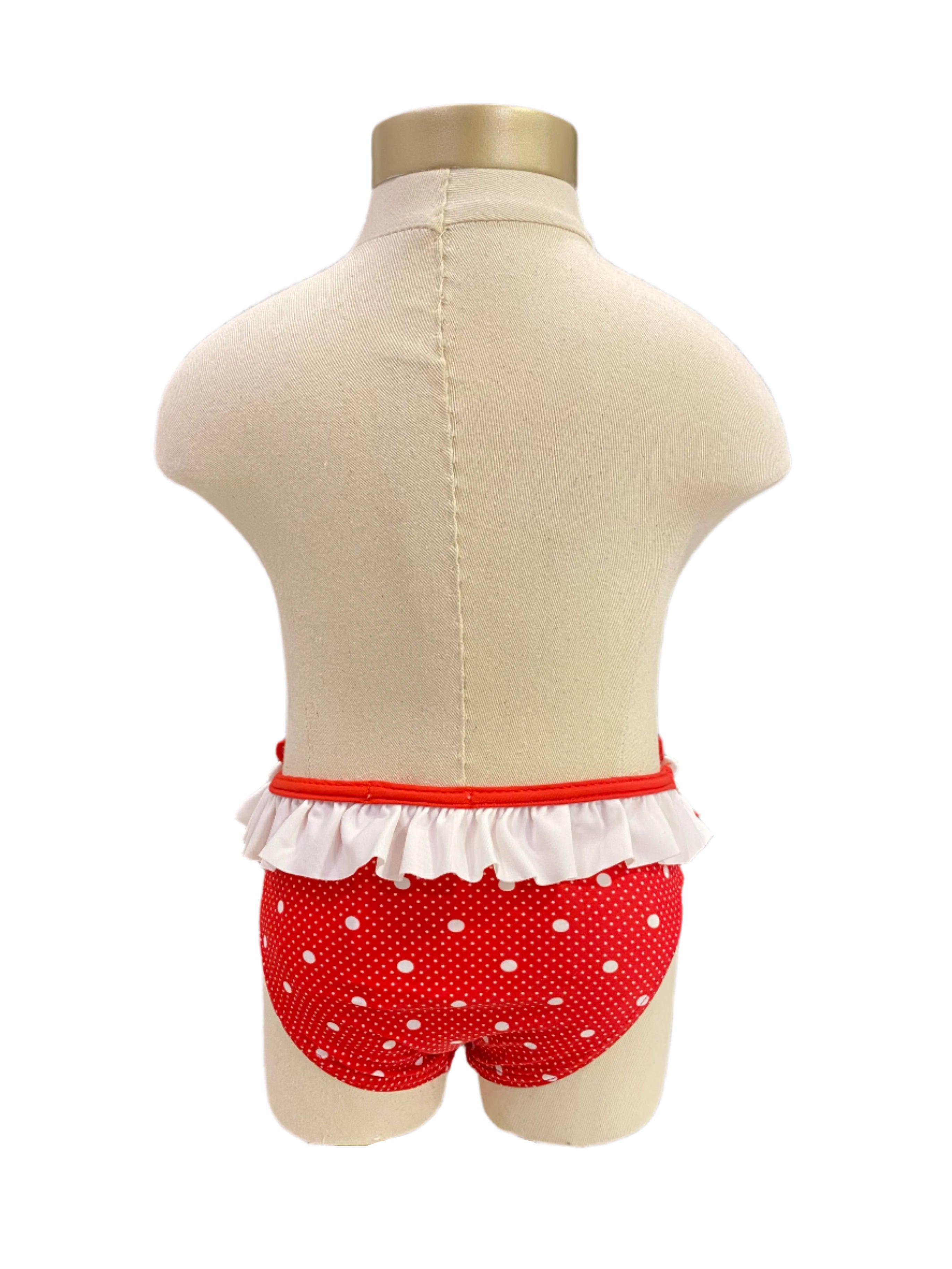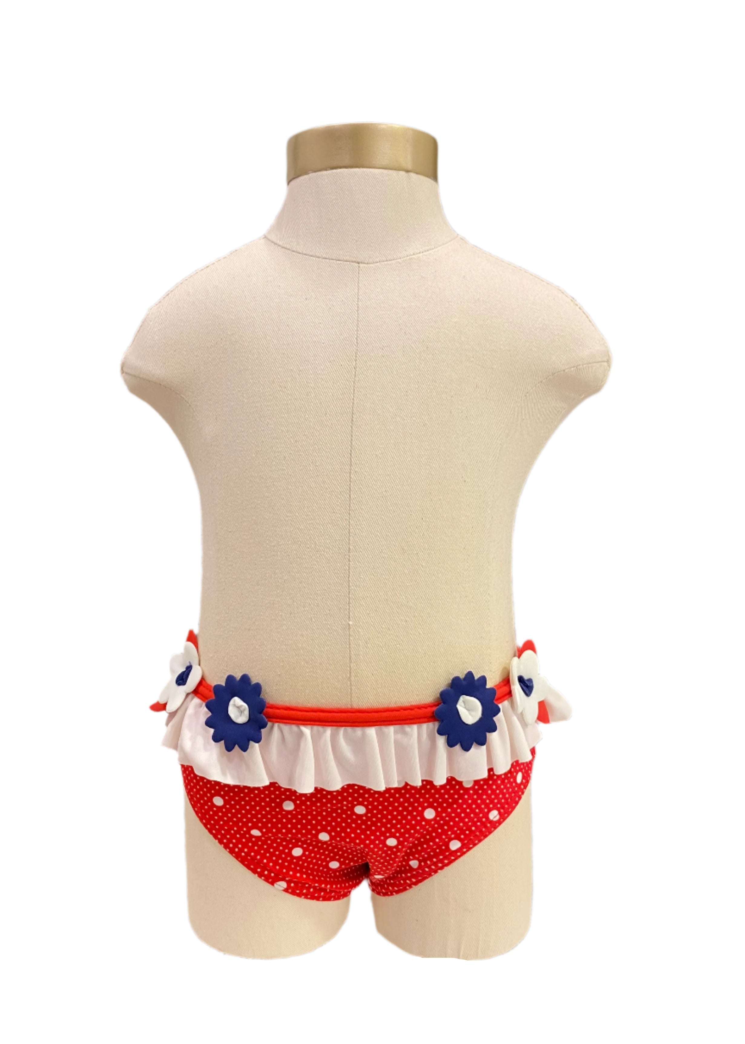 Set of 2 cute bikini from Mayoral. Stripe and polka dots design prints with flower applique. It has ruffled fabric below the waistband.