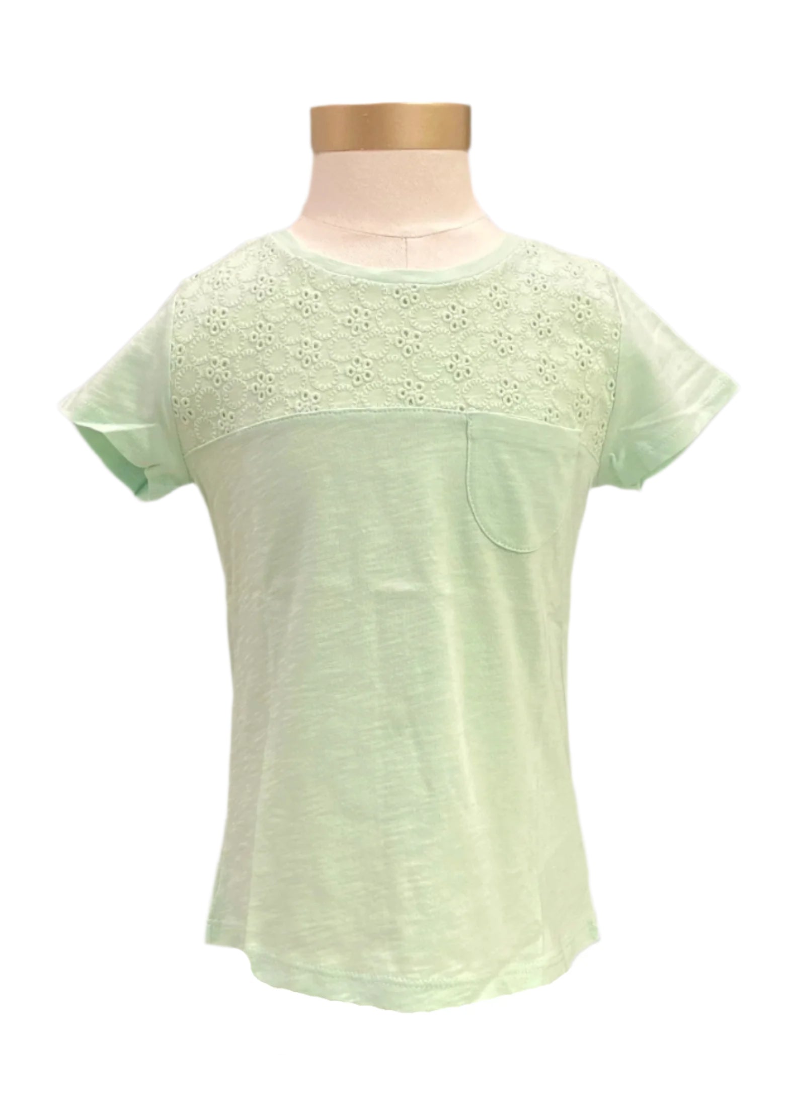 This top is simply designed with flower holes below the neckline, with a small pocket on the left chest. A product of Mayoral from Spain.