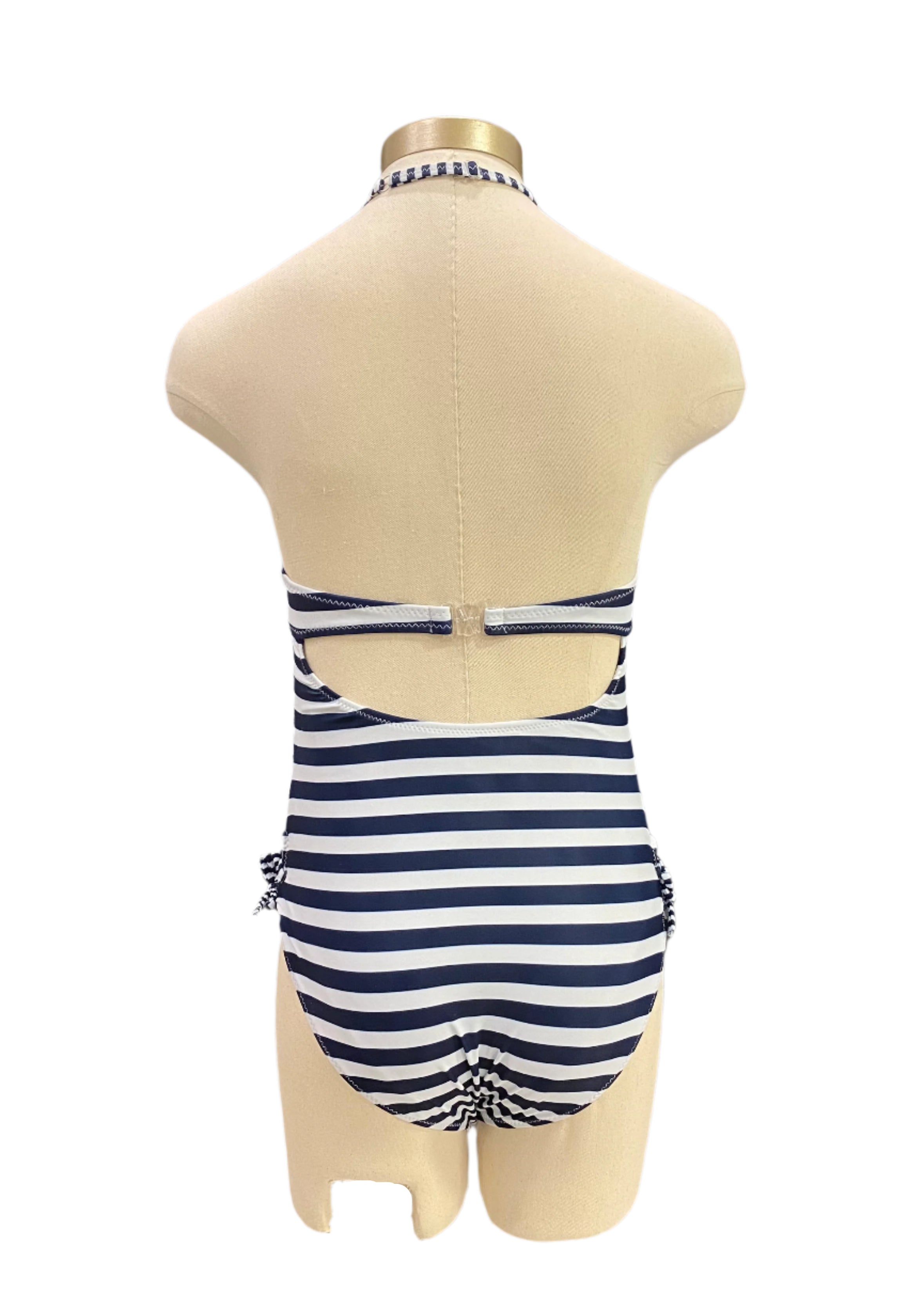 Striped, halter strap one-piece swimsuit with ribbon on both sides. Crisscross lace-up on the front. Chic. A product of Mayoral from Spain.