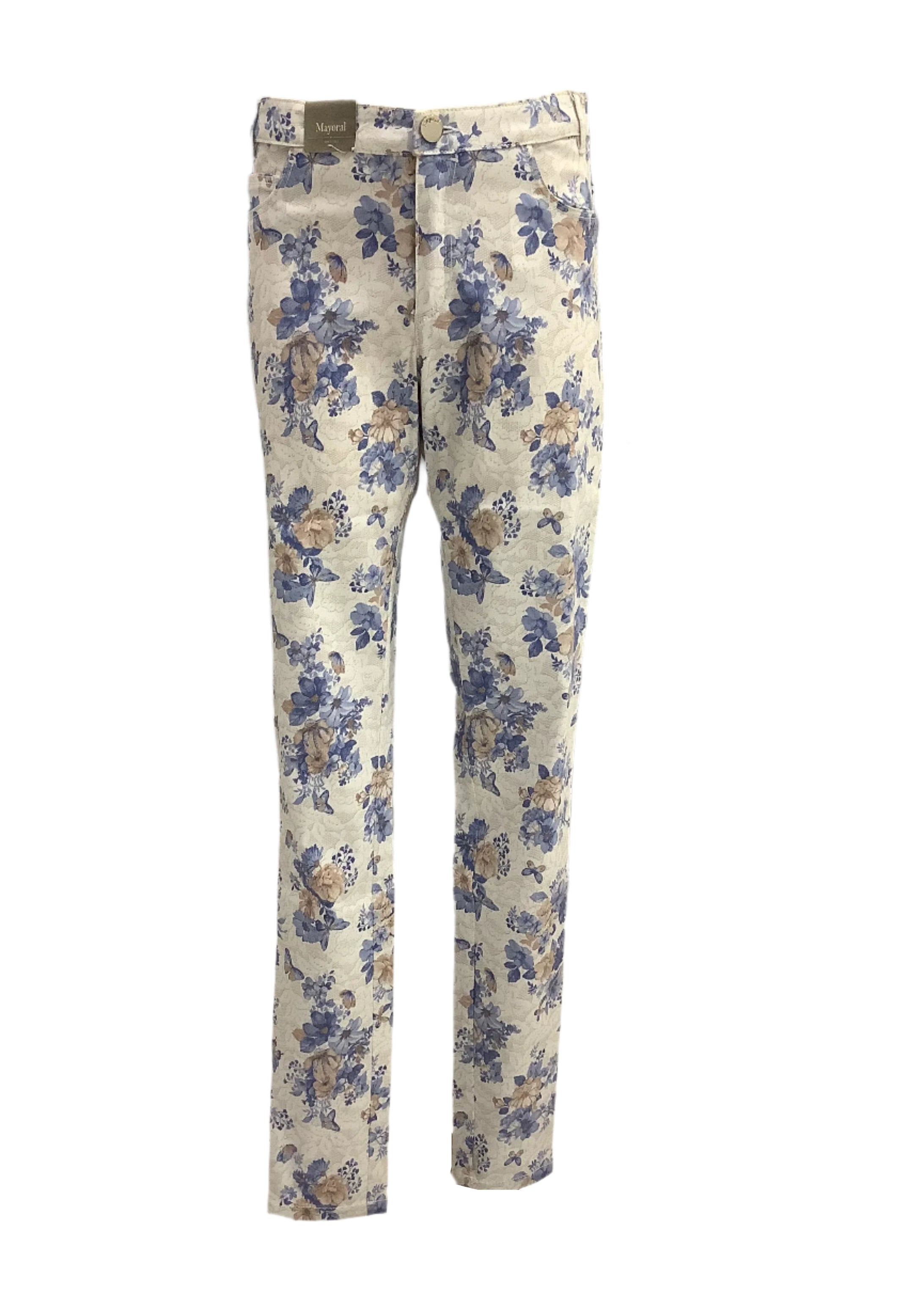 Stretchy, soft trouser from Mayoral. It has an all over print design of flowers and butterflies. Stylish and comfortable to wear.