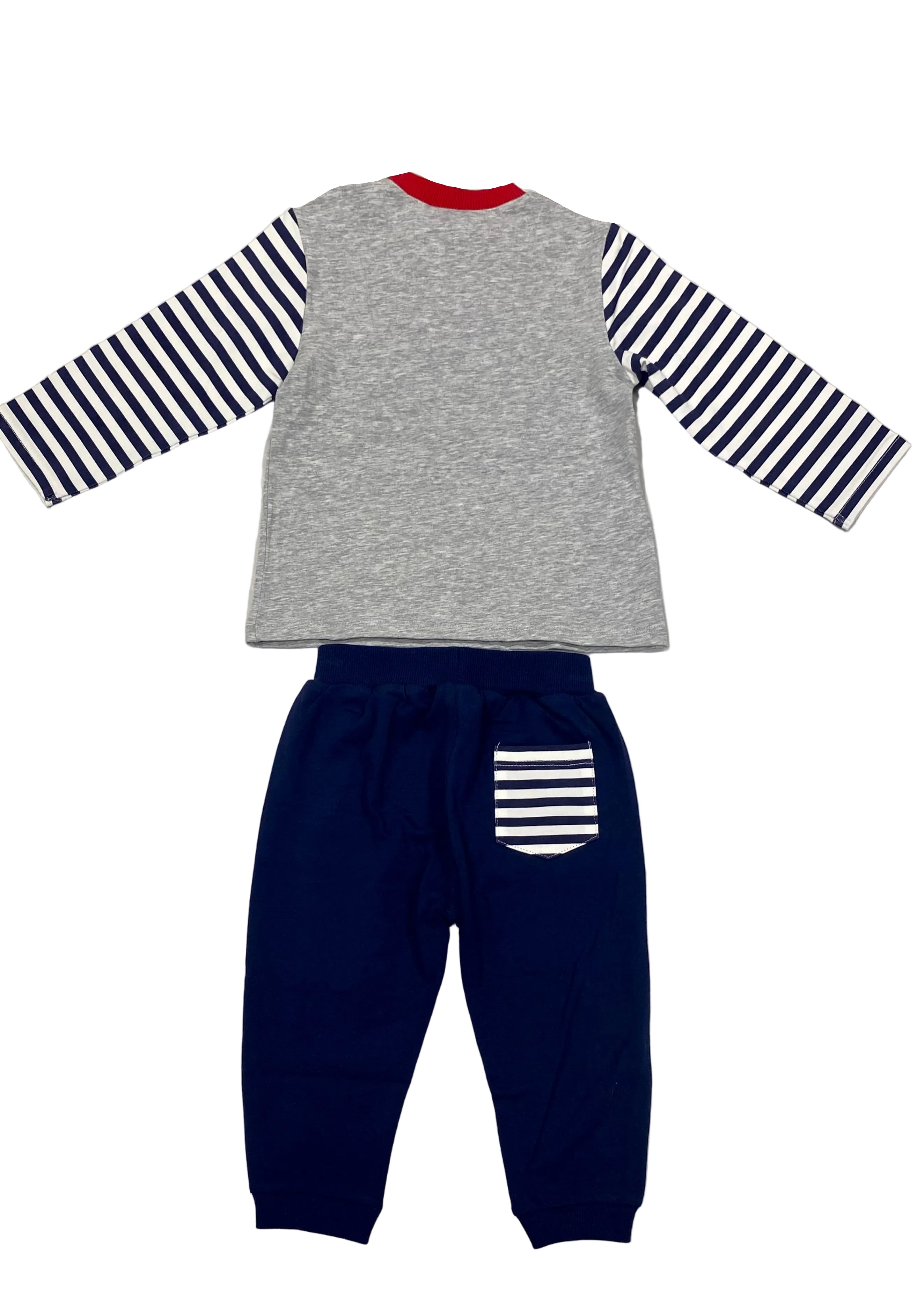 Stripe long sleeve t-shirt with snap button fastening on one shoulder for easy wearing, match with a soft pants, rib knit waistband and leg hem.