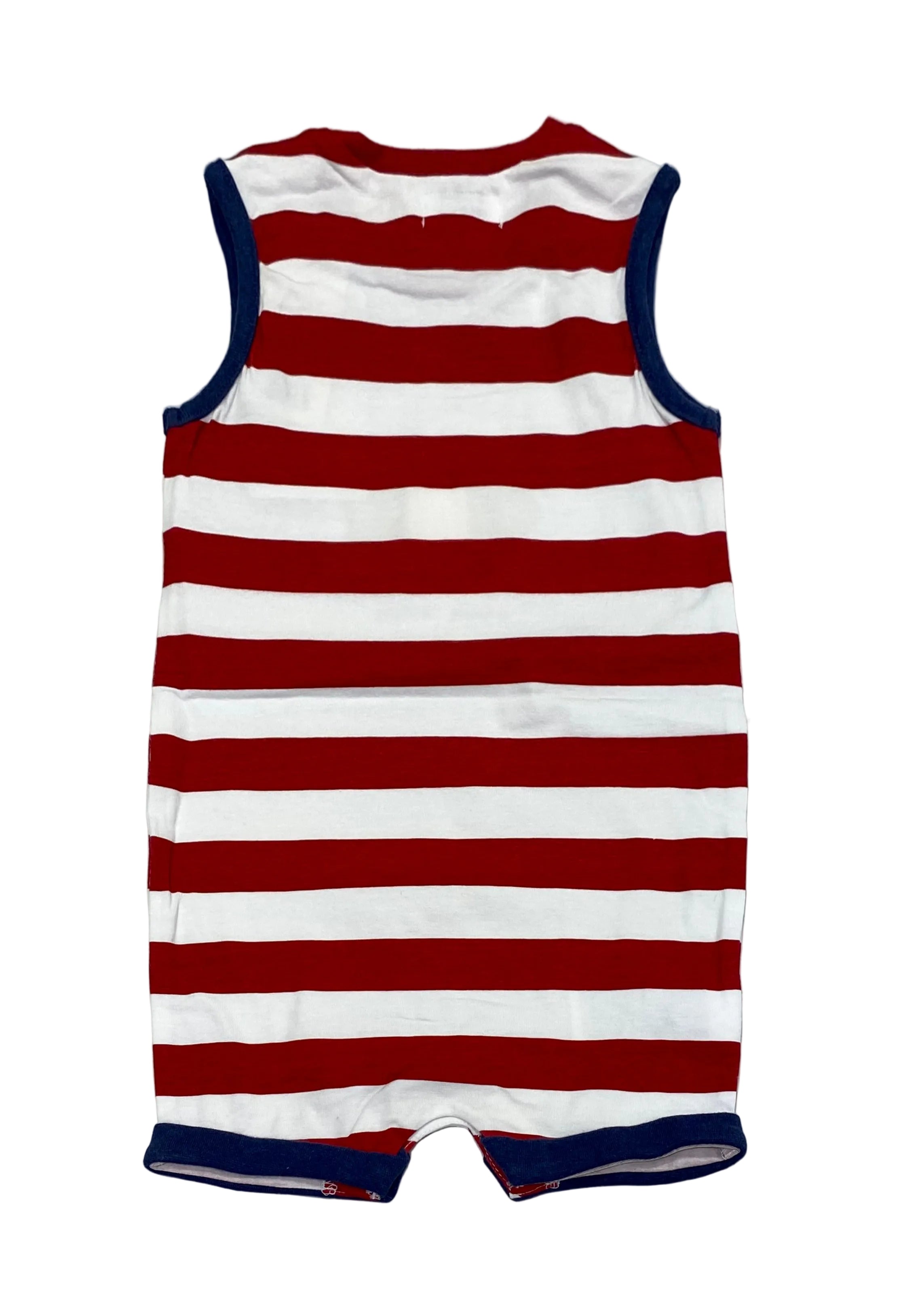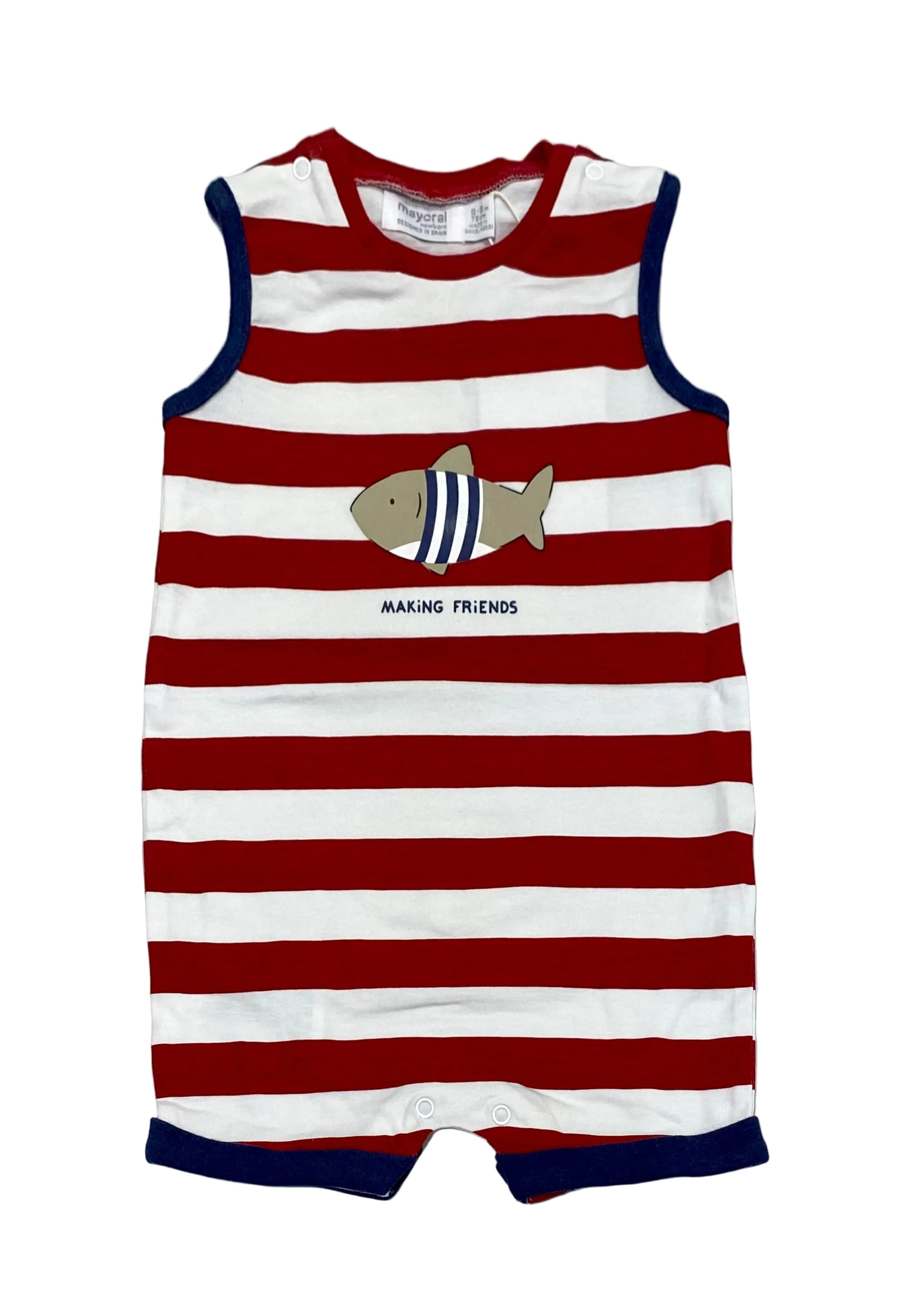 Adorable, sleeveless baby boy shortie romper. It has medium stripe pattern design with fish print on the chest. It has snap button fastening on both shoulders and on the crotch for easy wearing.