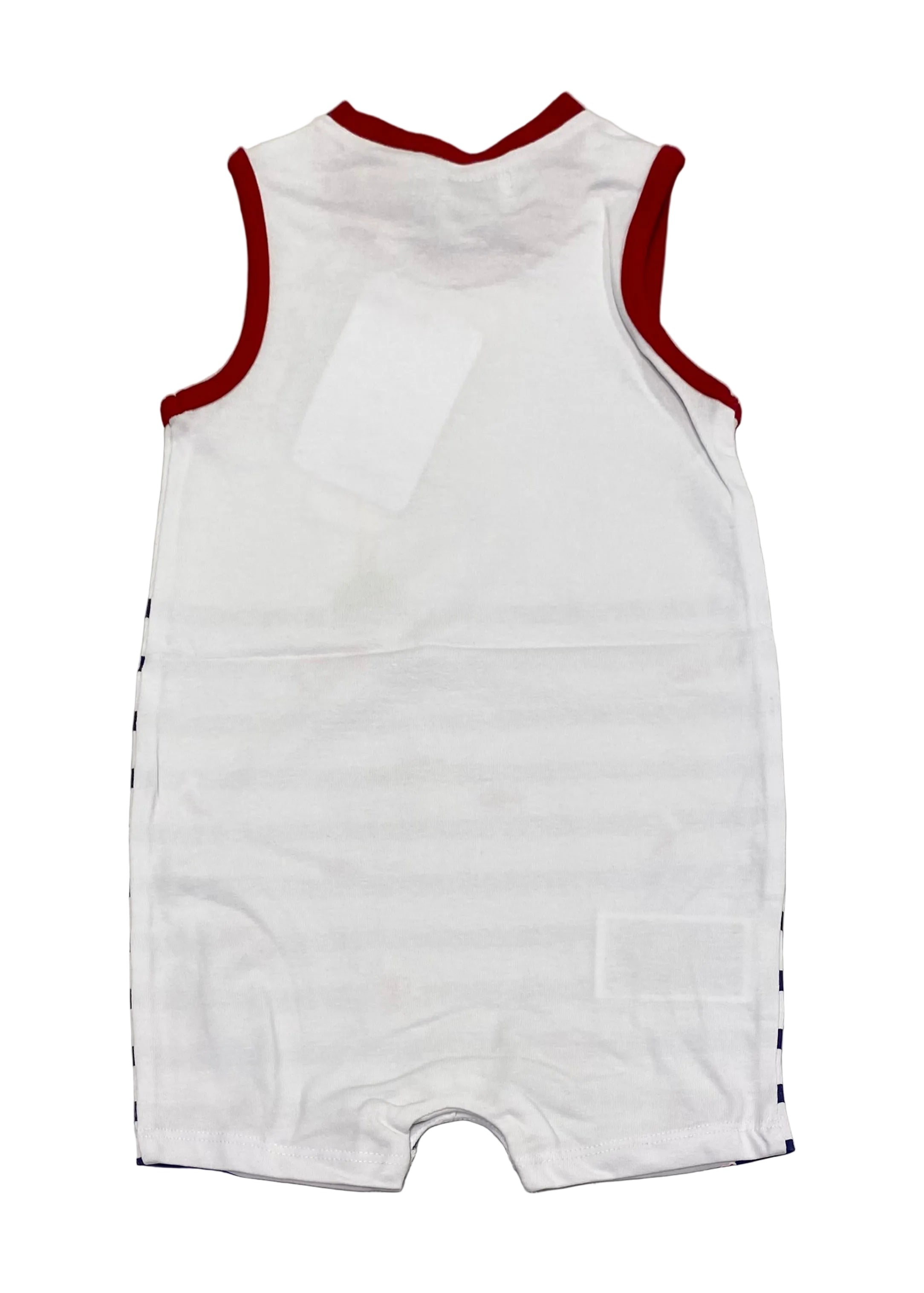 Sleeveless baby boys' shortie. It is designed with striped pattern, chick and sea creatures print. Snap button fastening on both shoulders and on the crotch. Soft and comfortable everyday wear for your baby.