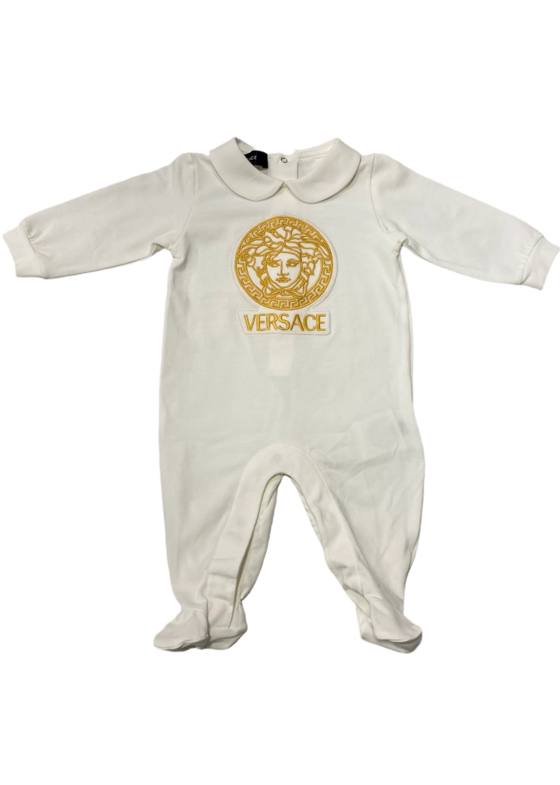 Classic Versace baby romper. Simply designed with an embroidered medusa logo on the front with 'VERSACE' writing embroidery under it. Choir-boy collar, snap button fastening at the back and in between legs.
