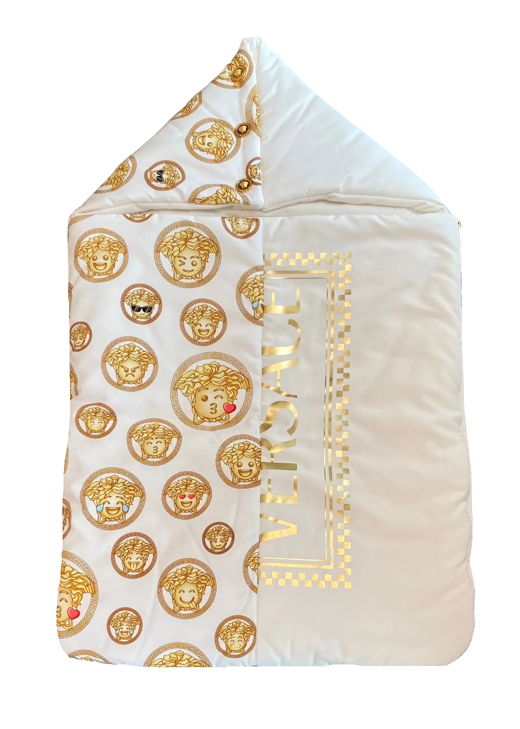 A lightly padded baby nest from the luxury brand, Versace. Featuring medusa emoji print. Zip fastening on one side, with golden Greca poppers on the hood. Soft and comfortable to use for your baby.