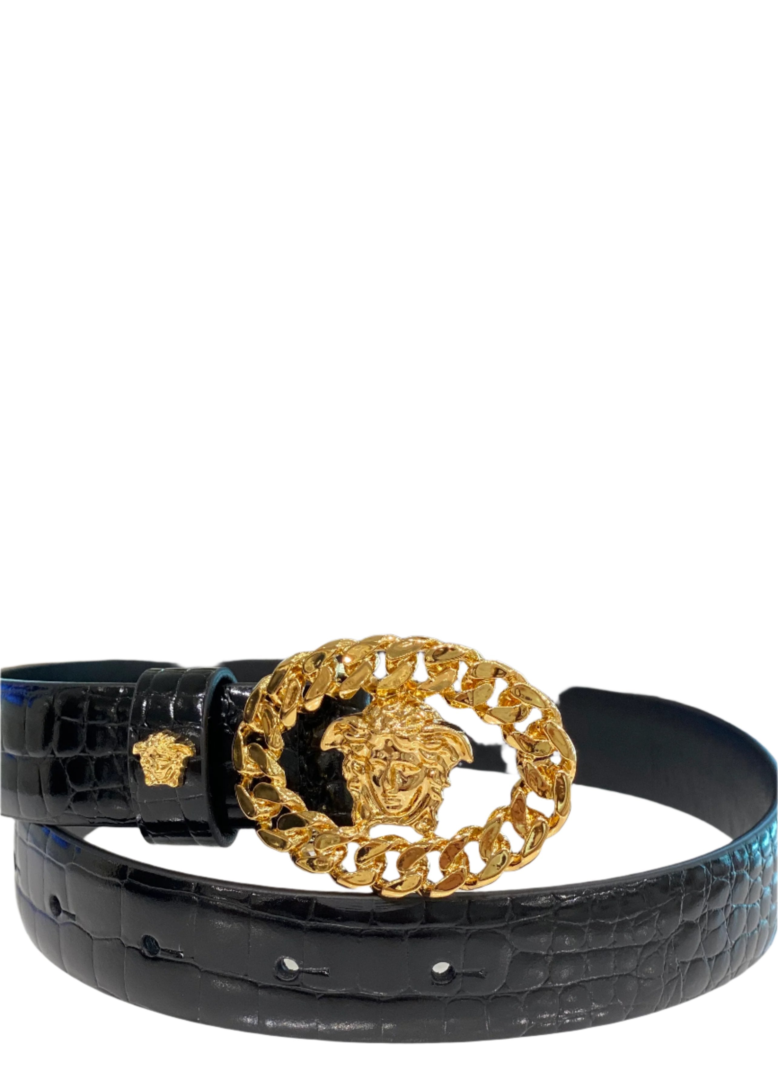 Made from smooth leather, this belt has a croc-effect, accented by a medusa gold chain buckle with extended strap.