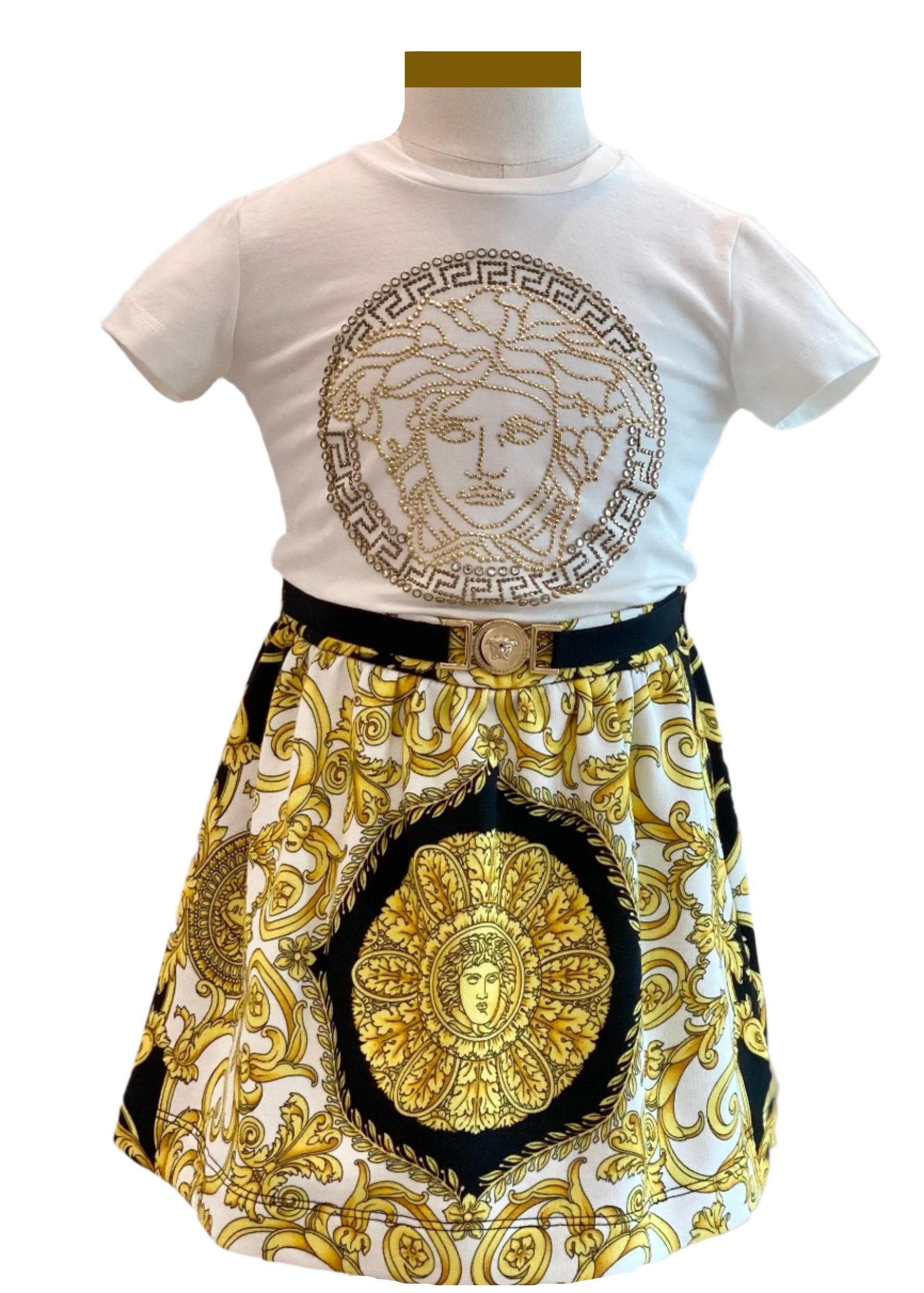 Classic, elegant skirt set from the luxury brand Versace. This set comes with a top designed with medusa logo in studs and a soft skirt all over printed with frenzy barocco design, finished golden medusa buckle in an attached belt.