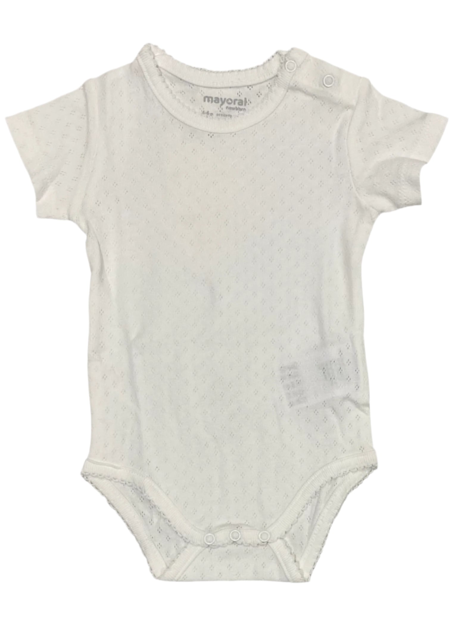 All over micro holes design short sleeve bodysuit with snap button on left shoulder and in between legs. A product of Mayoral from Spain.