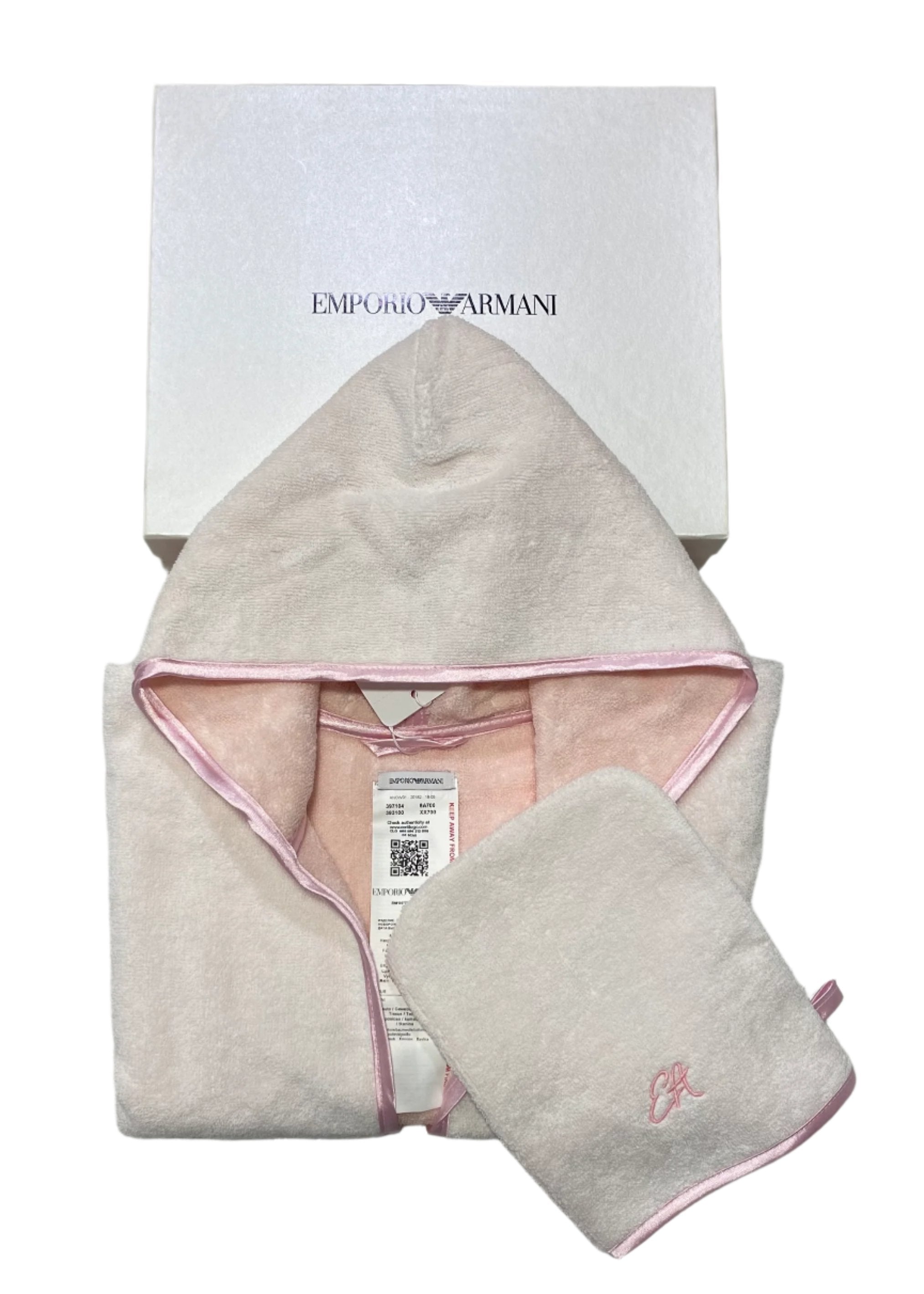 Cotton soft newborn bathrobe set. Both are simply yet exquisitely having pink silky edge as a design, finished with a brand initial. Ideal for newborn gift.