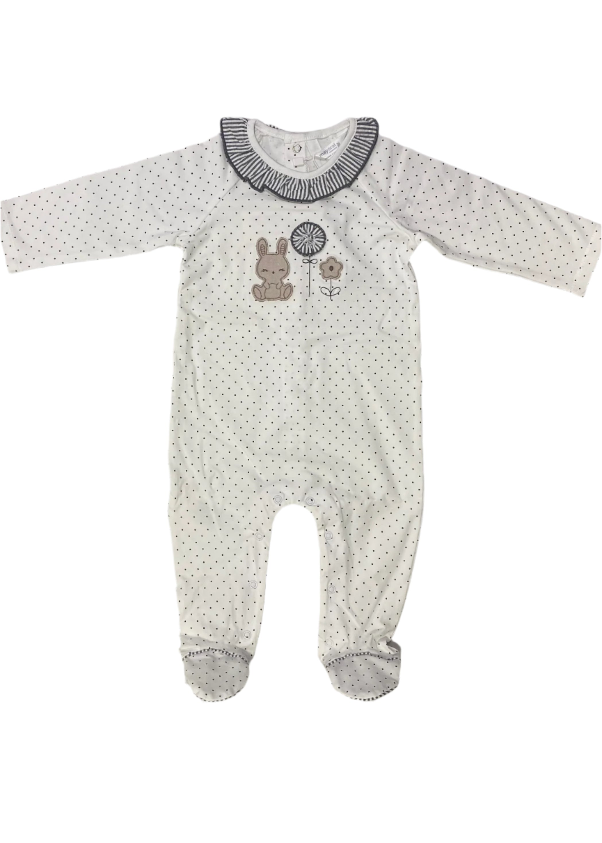 An all over mini polka print romper. Designed with embroidered rabbit and flower on the chest. Snap button fastening at the back and in between legs.