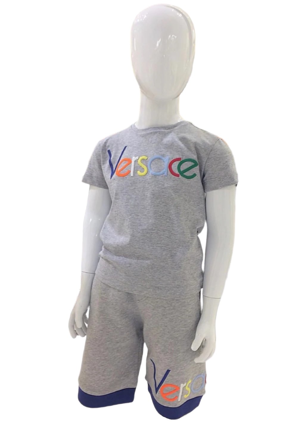 Casual boy's outfit made with cotton soft jersey. It comes with a short sleeve t-shirt and a short with solid color on the hem and is elasticated on the waist. Both top and short are designed with a multi-color 'VERSACE' embroidery.