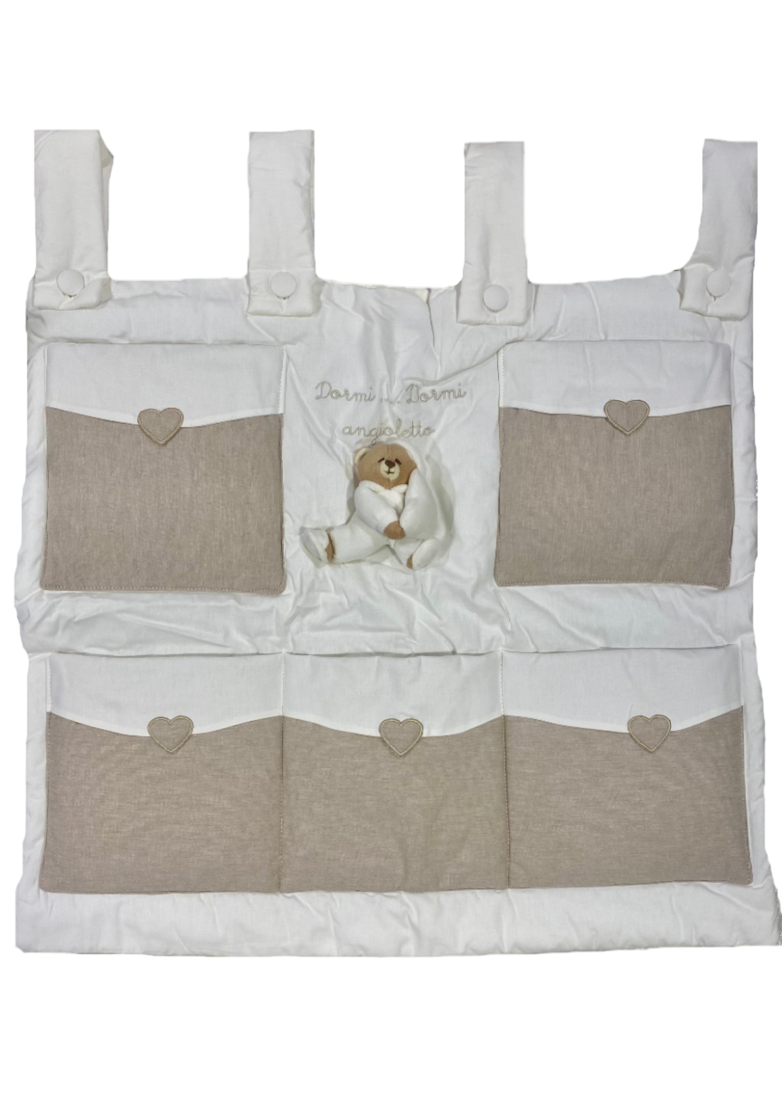 Has embroidered five pockets and with bear tato. It can be hang on wall or on baby's bed. Soft and easy to wash.