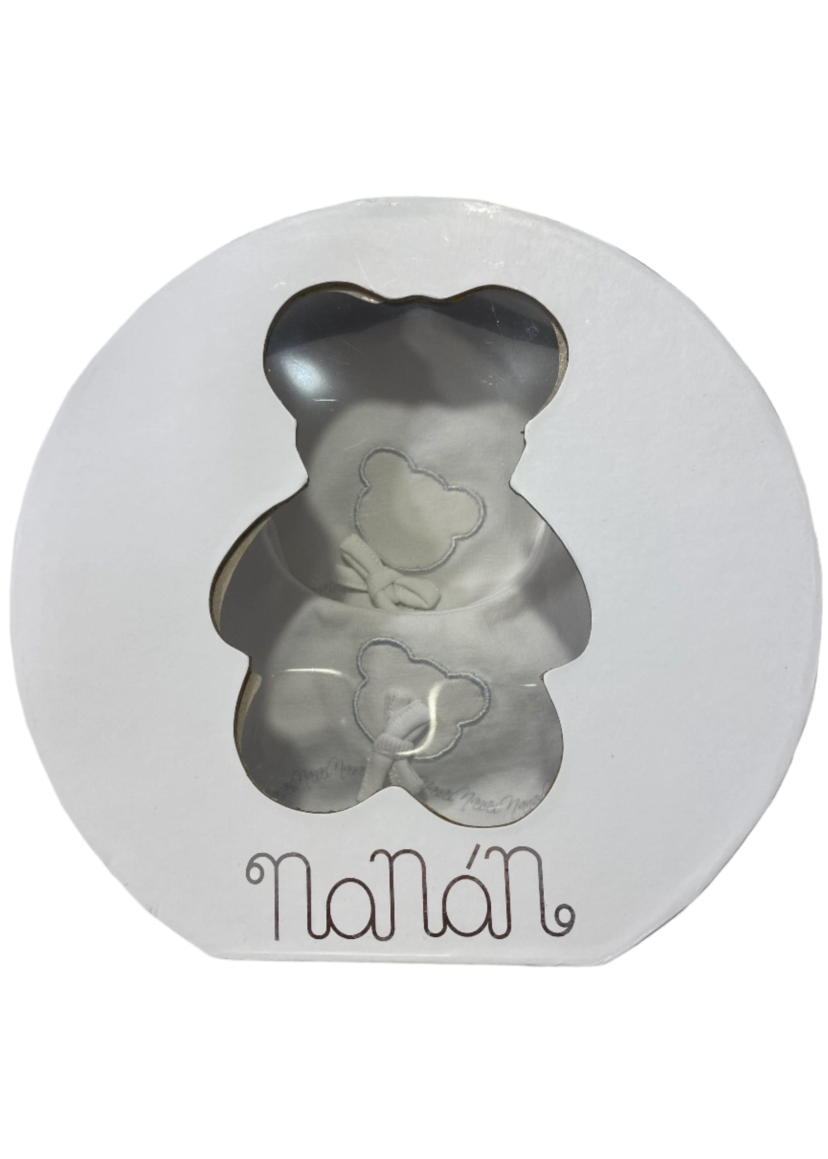 A cute gift box that comes with hat and a bib, both are embroidered with a bear outline. A product of Nanan from Italy.
