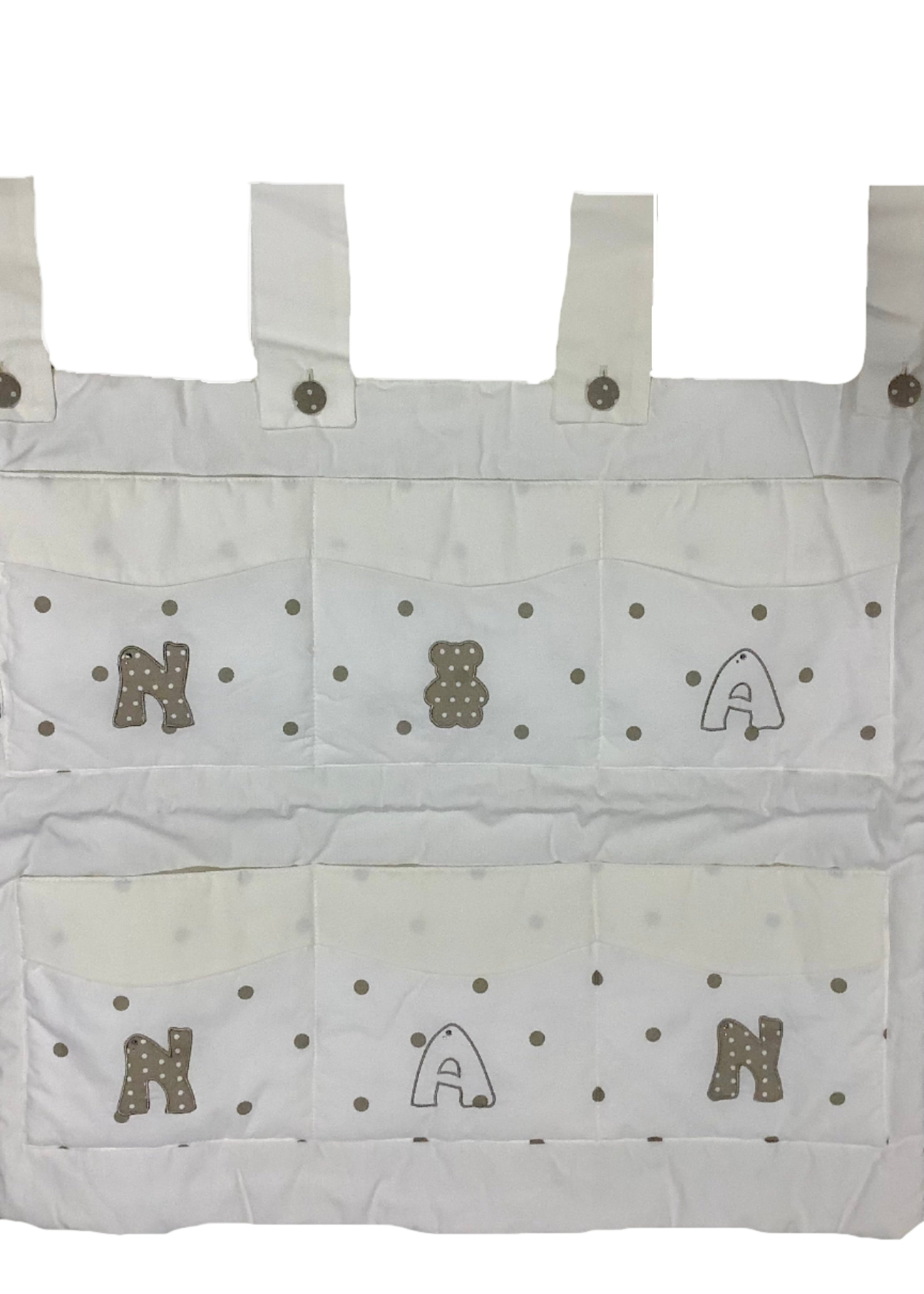 Perfect size storage cloth for your baby things. Designed with strap to hang on the slat side of the bed. It has six available pockets, each pocket has polka dot prints, with embroidered letter and a bear enhanced with crystal. A product of Nanan from Italy.