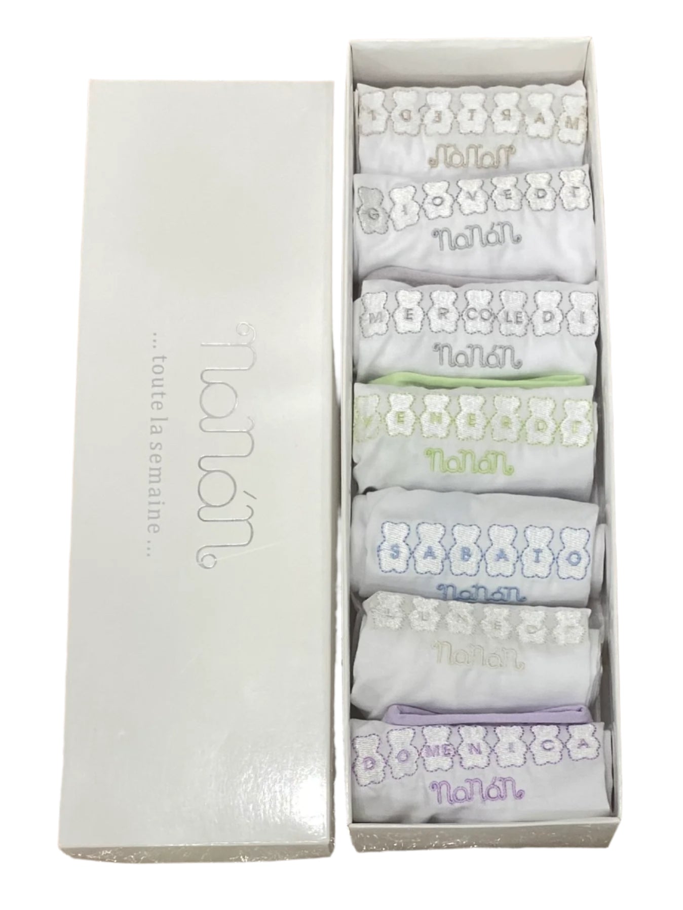 A set of 7 placemats for your baby. Each placemat is embroidered with a day of the week in different colors. Can use as a burping cloth. A product of Nanan from Italy.