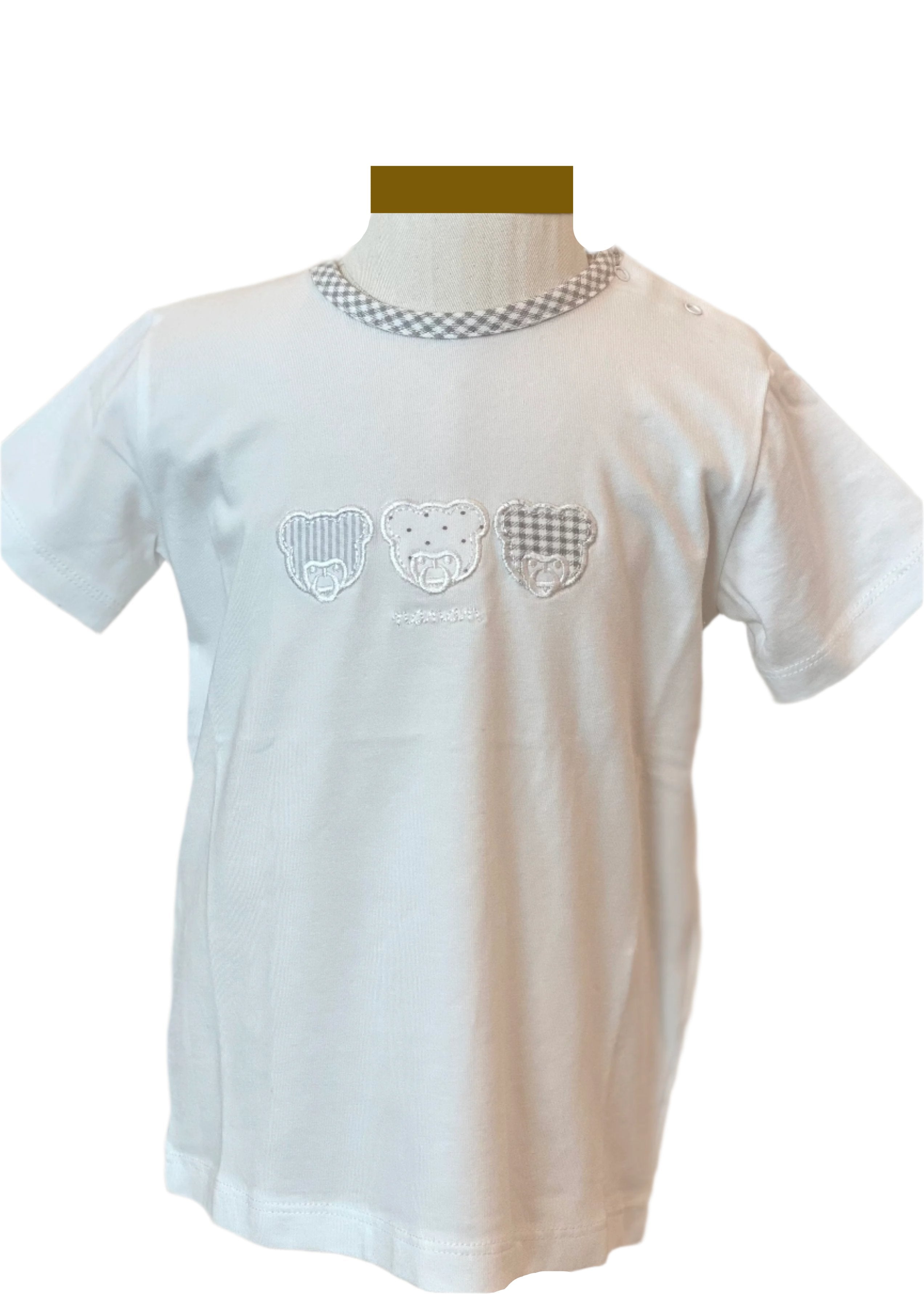 Simple yet cute t-shirt for your baby. Round neck with checkered prints, short sleeves and is embroidered with bear patches in different pattern prints. It has poppers on the shoulder for easy wearing. A product of Nanan from Italy.