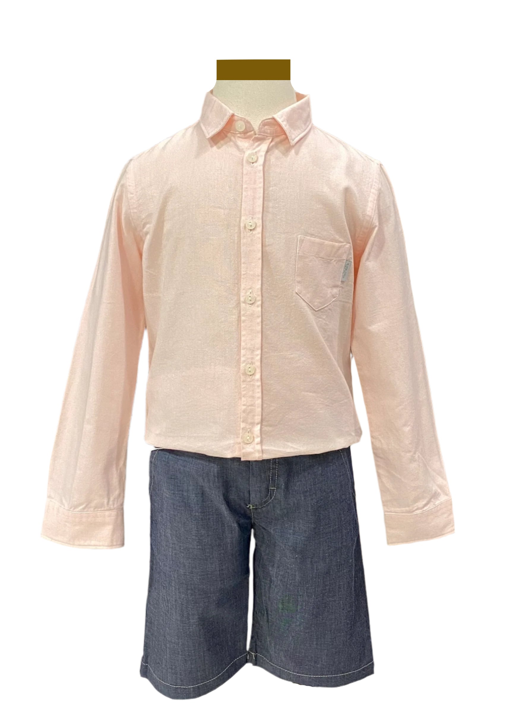 A semi formal outfit set from Nanan. This set comes with a pink long sleeve shirt with pocket and is perfectly matched with a blue gray short with pockets on front sides.