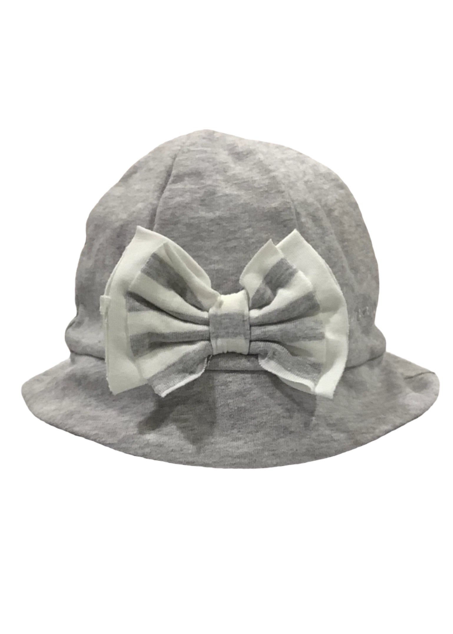 Adorable gray cap for your baby girl. Simply designed by a striped gray and white ribbon bow to the front and an embroidered brand name.