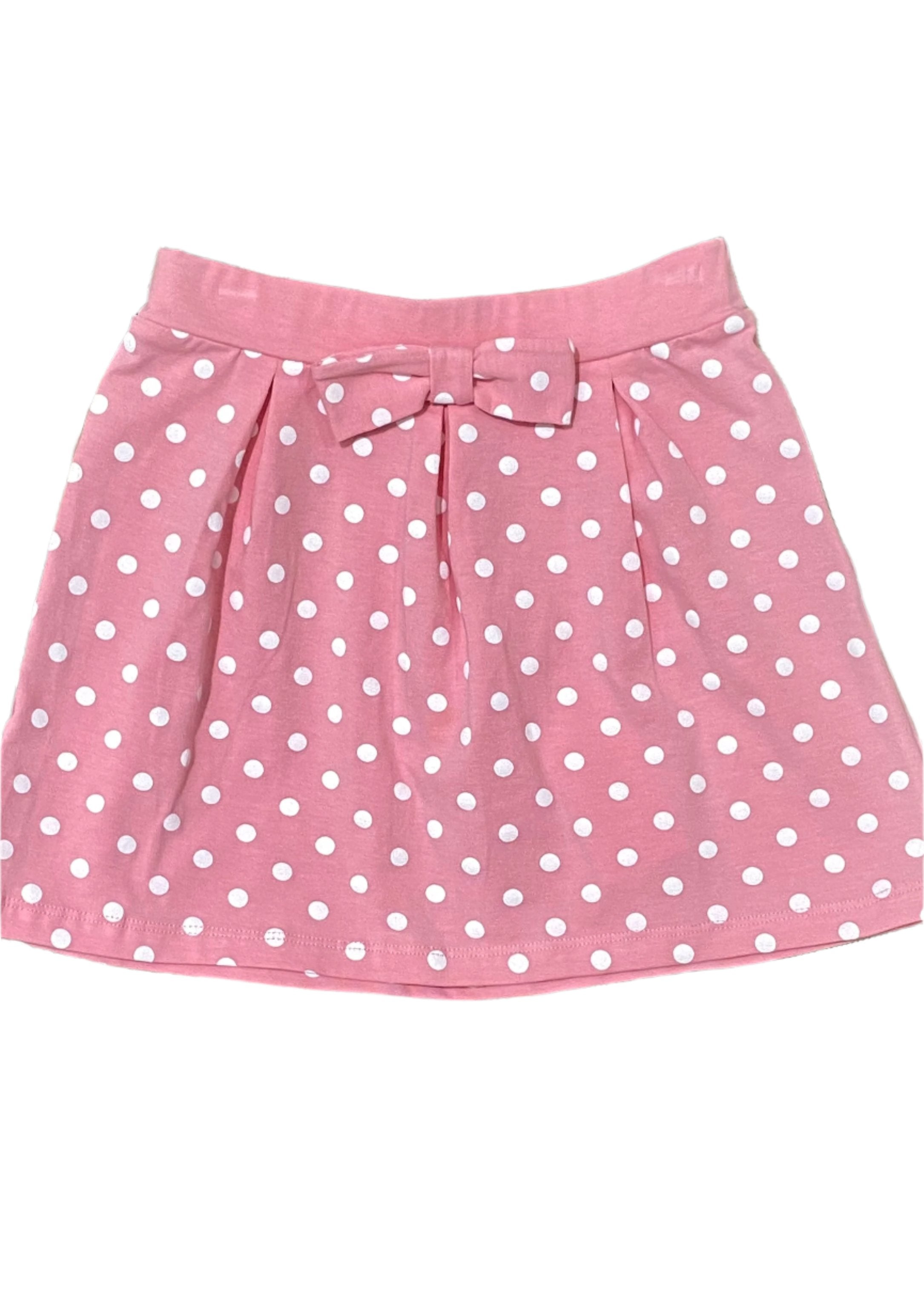 An all-over white polka dot printed skirt, with elasticated waistband. Simply designed with bow and has pleats on the front and at the back. A product of Nanan from Italy.