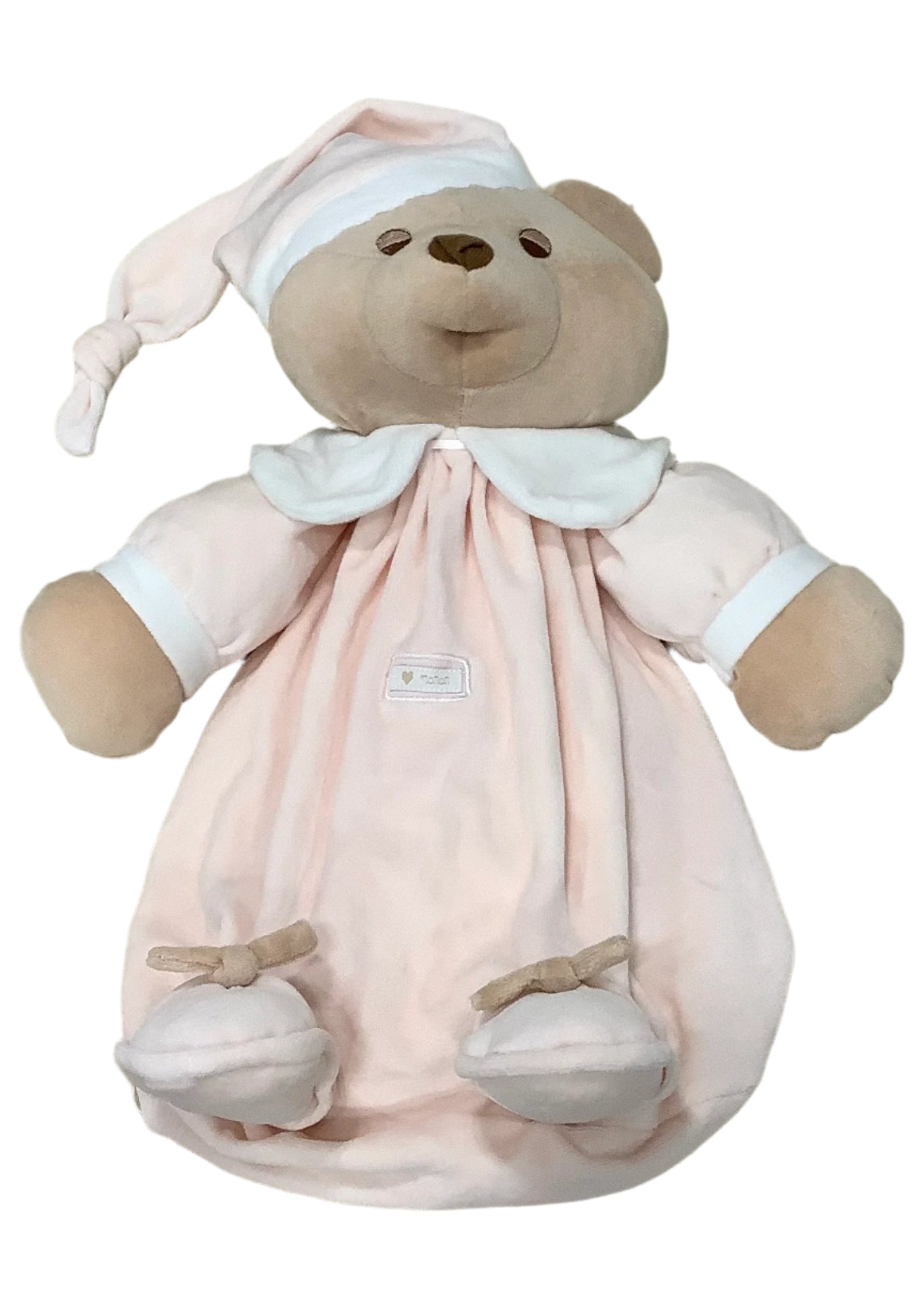 Height: 55cm. Cute and soft doudou pyjama case from Nanan. It has strap designed to hang beside the bed, with brand name embroidery on the center. Back zip opening.