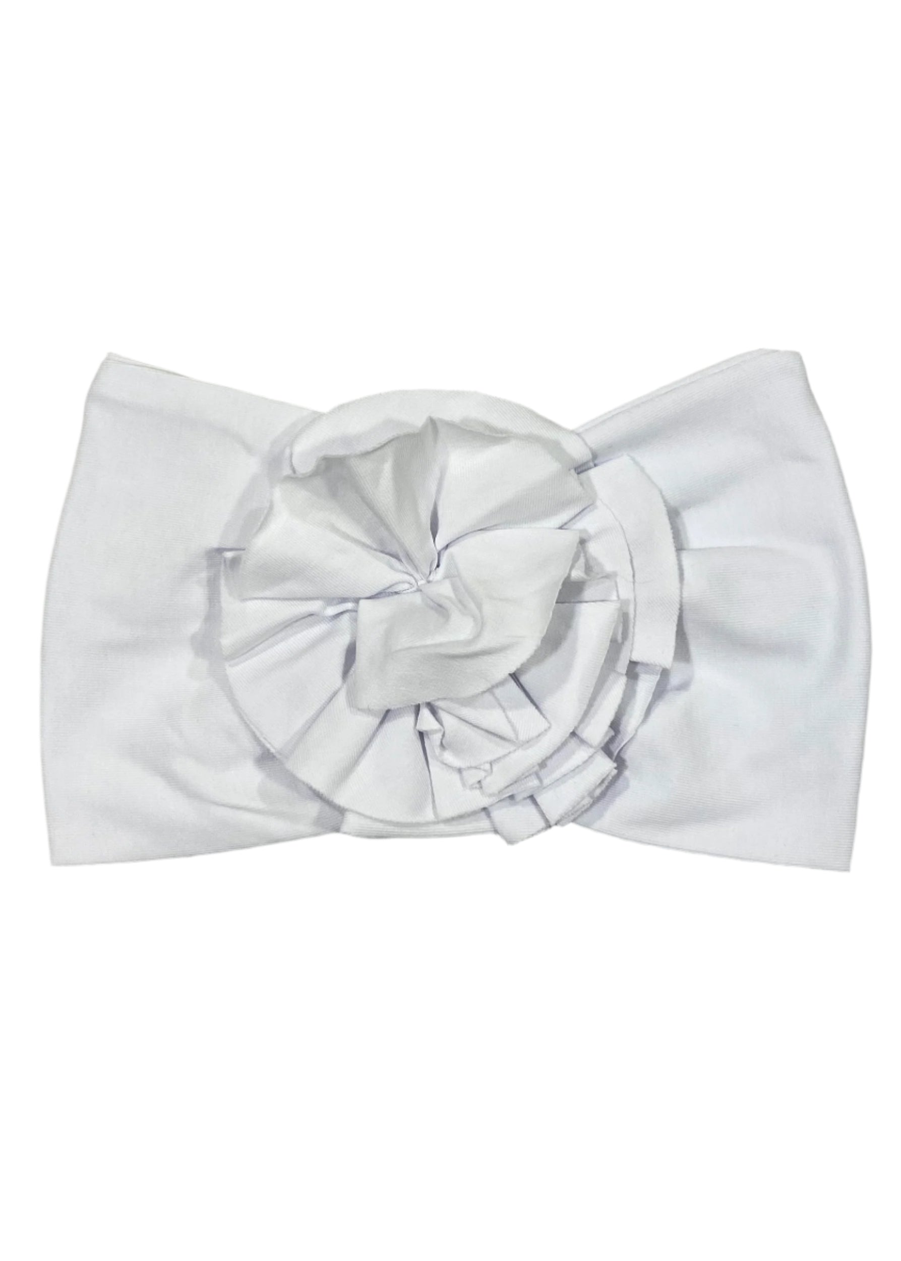 White stretchable wide band headband. Has floral ribbon applique design. It is soft and comfortable to wear. Additional accessory to your little girl's outfit.