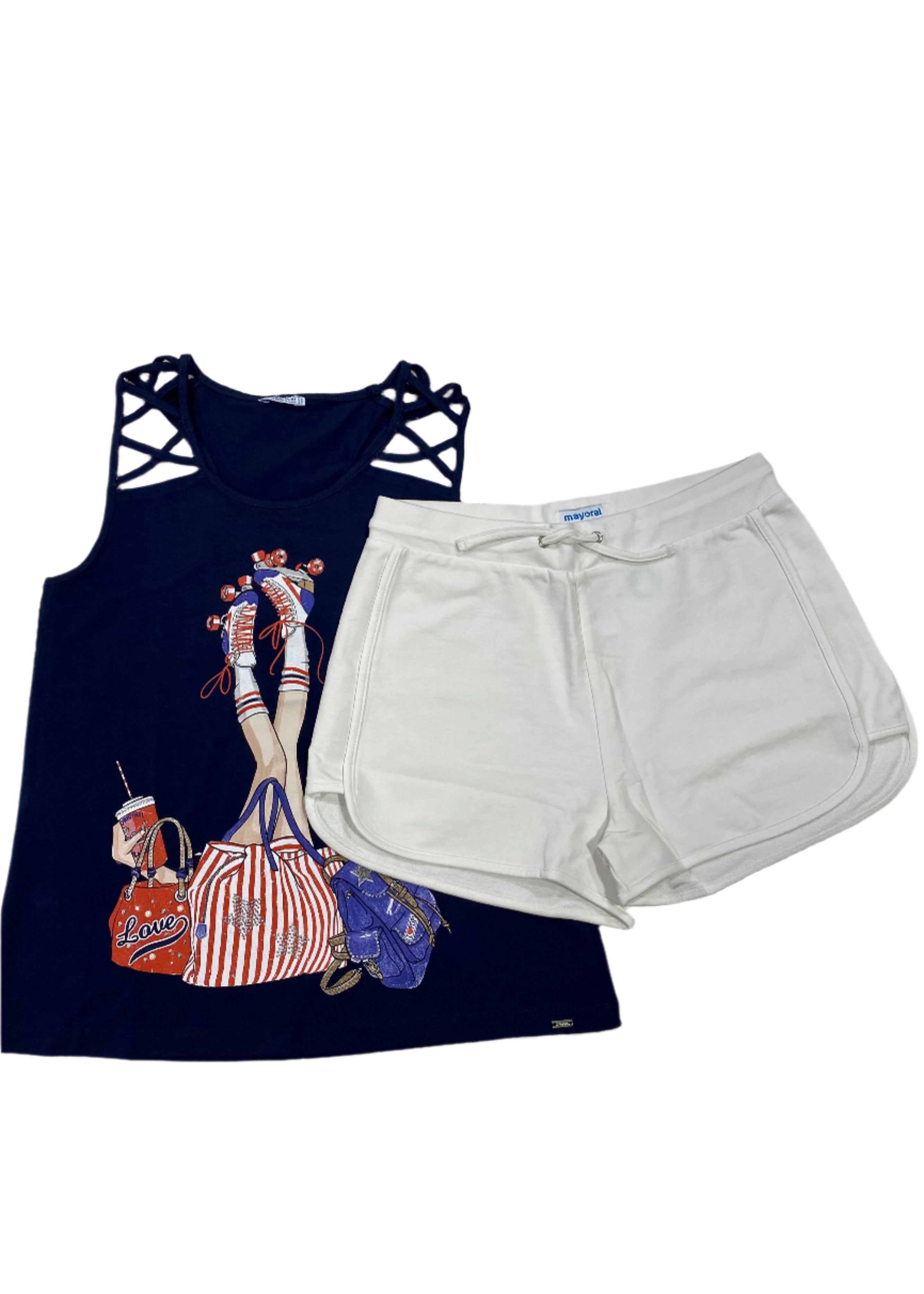Blouse with soft, stretchy jersey fabric. Sleeveless with cross shoulder design strap and has bags and legs with roller skates design printed on the chest. White shorts has elasticated waistband with drawstring.