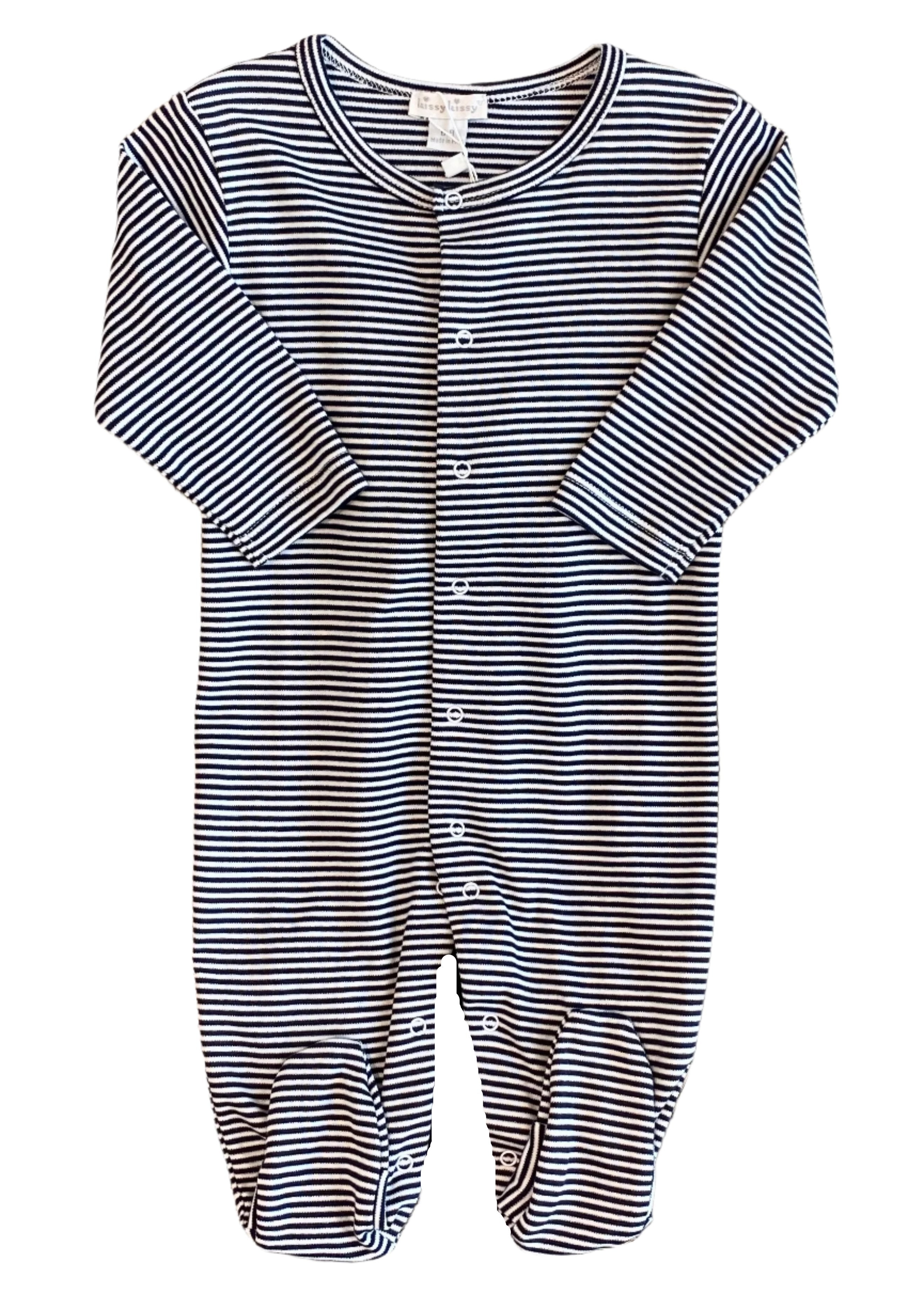 Cotton soft navy-blue baby boy footie. Stripe design with snap button fastening on the front and in between legs.