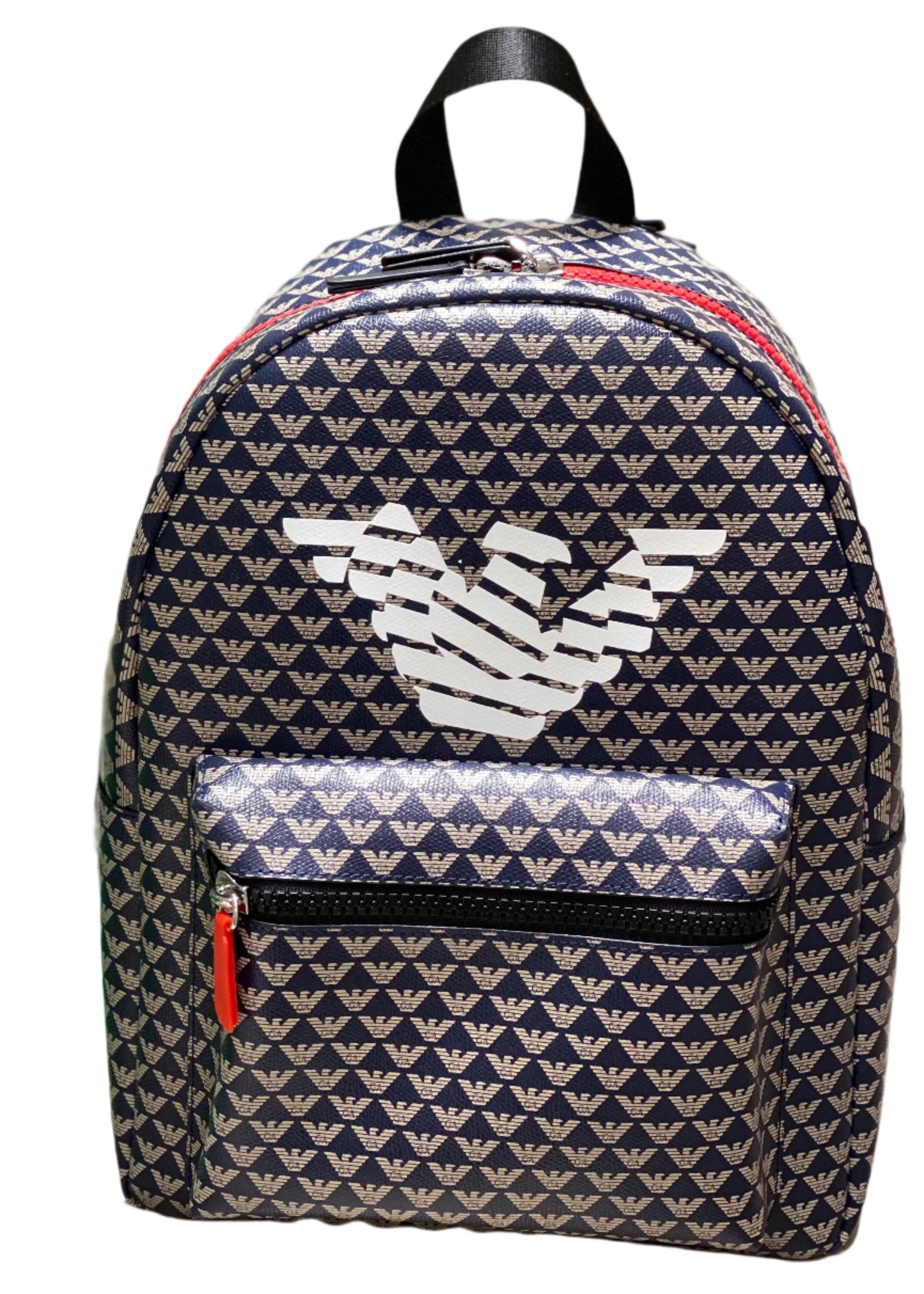 Spacious boy's backpack with extra front compartment. All over printed with Armani logo as a design. Zip fastening, adjustable straps.