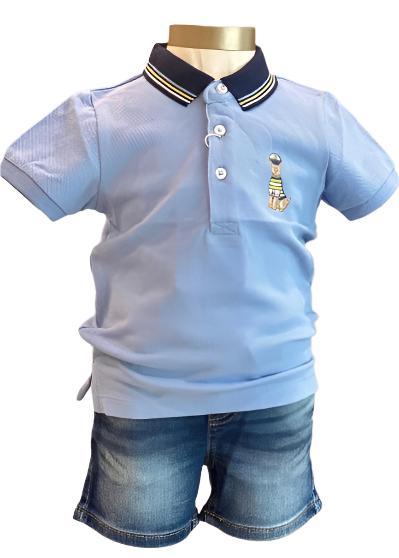 Casual short set for baby boy. This set comes with a shirt designed with navy dog sticker on the left chest and a stretchable washed denim short.