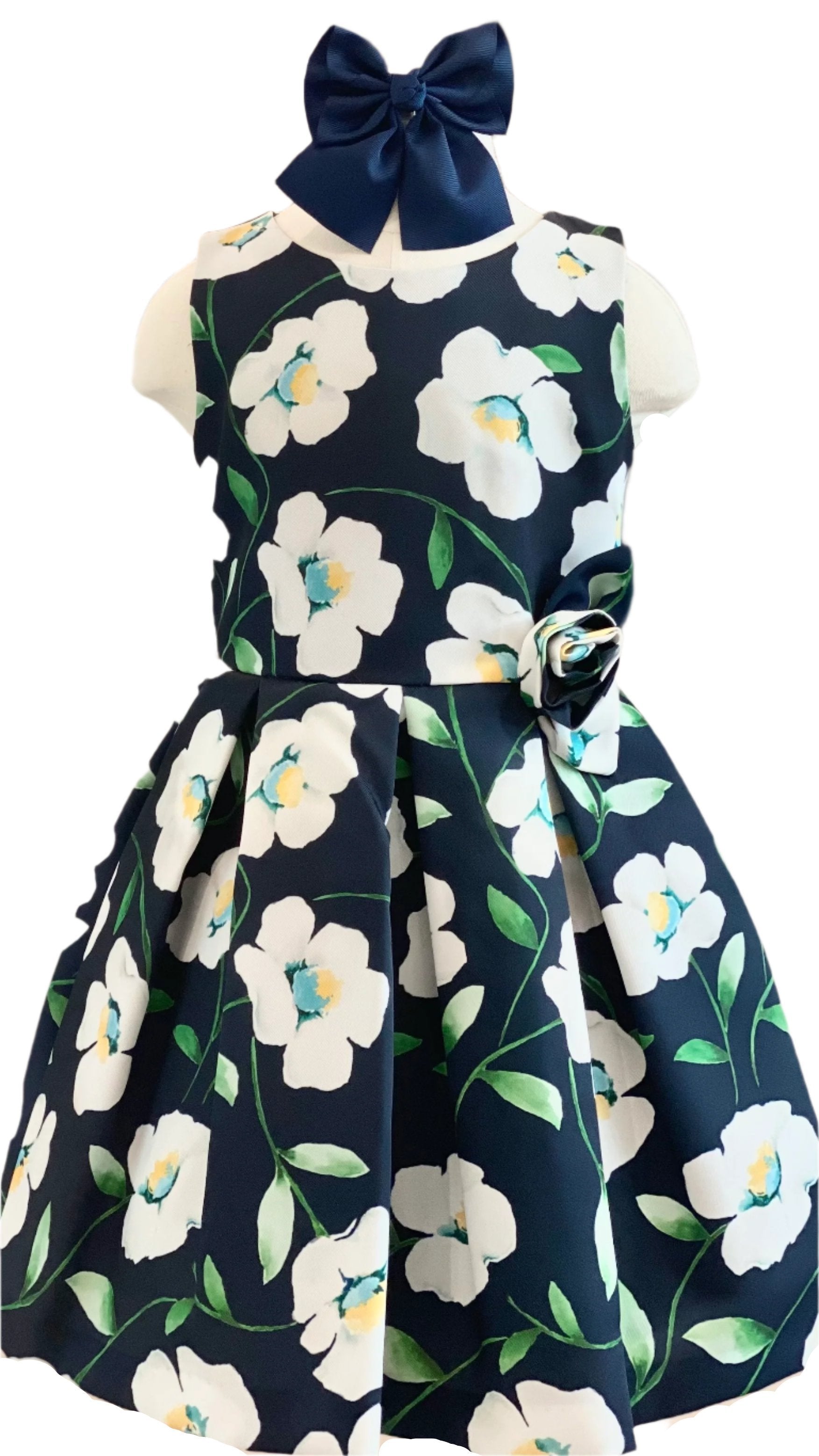 A sleeveless navy blue and white floral prints with flower applique on one side. Zip-up fastening. This dress comes with a matching hairclip.