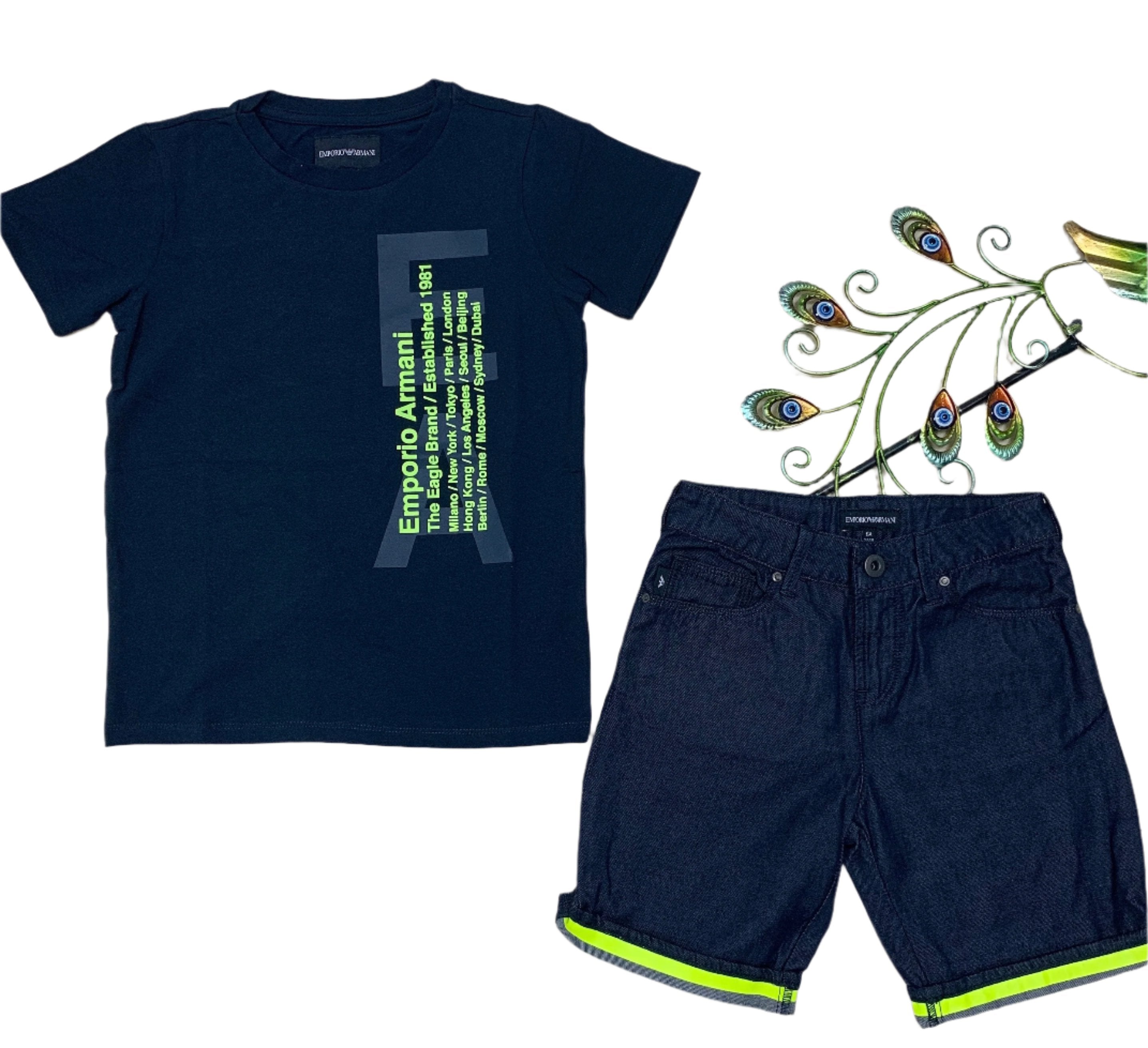 Made from soft, fine cotton jersey. With neon green inscription in the form of the brand's logo and a list of cities in which boutiques are located and printed on the front. Dark blue shorts are made from soft fabric with zip fastening, belt loops, five pockets, 'GA' eagle metal logo at the back and trouser legs have neon stripe detail.