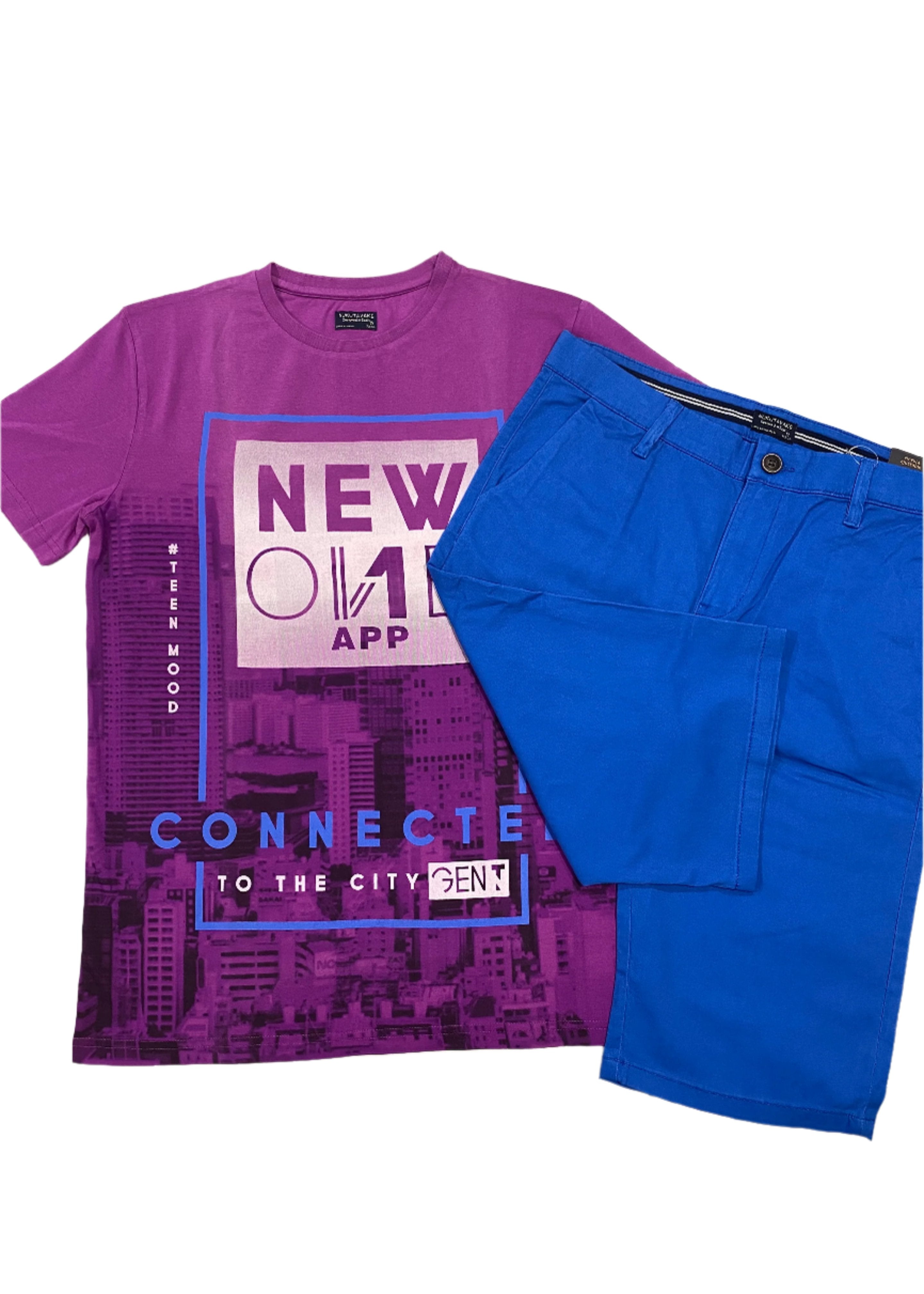 Boy's casual outfit. Purple t-shirt comes with a round neck, soft t-shirt with one new app design print on the chest and a bermuda blue short with belt loops,. Has zipper and button fastening with four pockets.