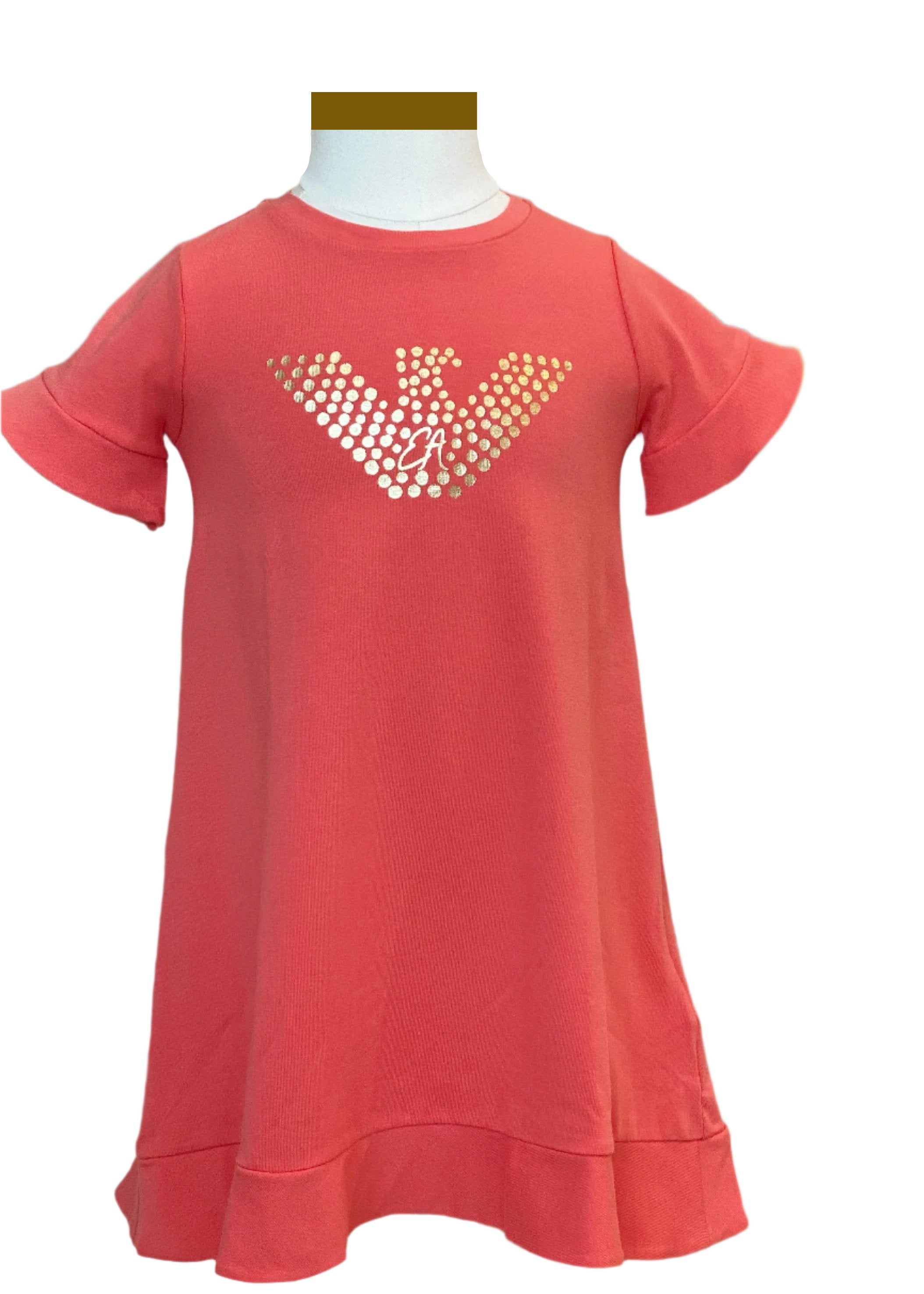 Orange dress with eagle 'EA' logo which is composed of several gold-colored dots. Made in soft and stretchable fabric. Also comes with short sleeves wide bands, and a narrow-banded neckline. The dress has a nice A-line cut, and at the bottom it has a wide ruffled band.