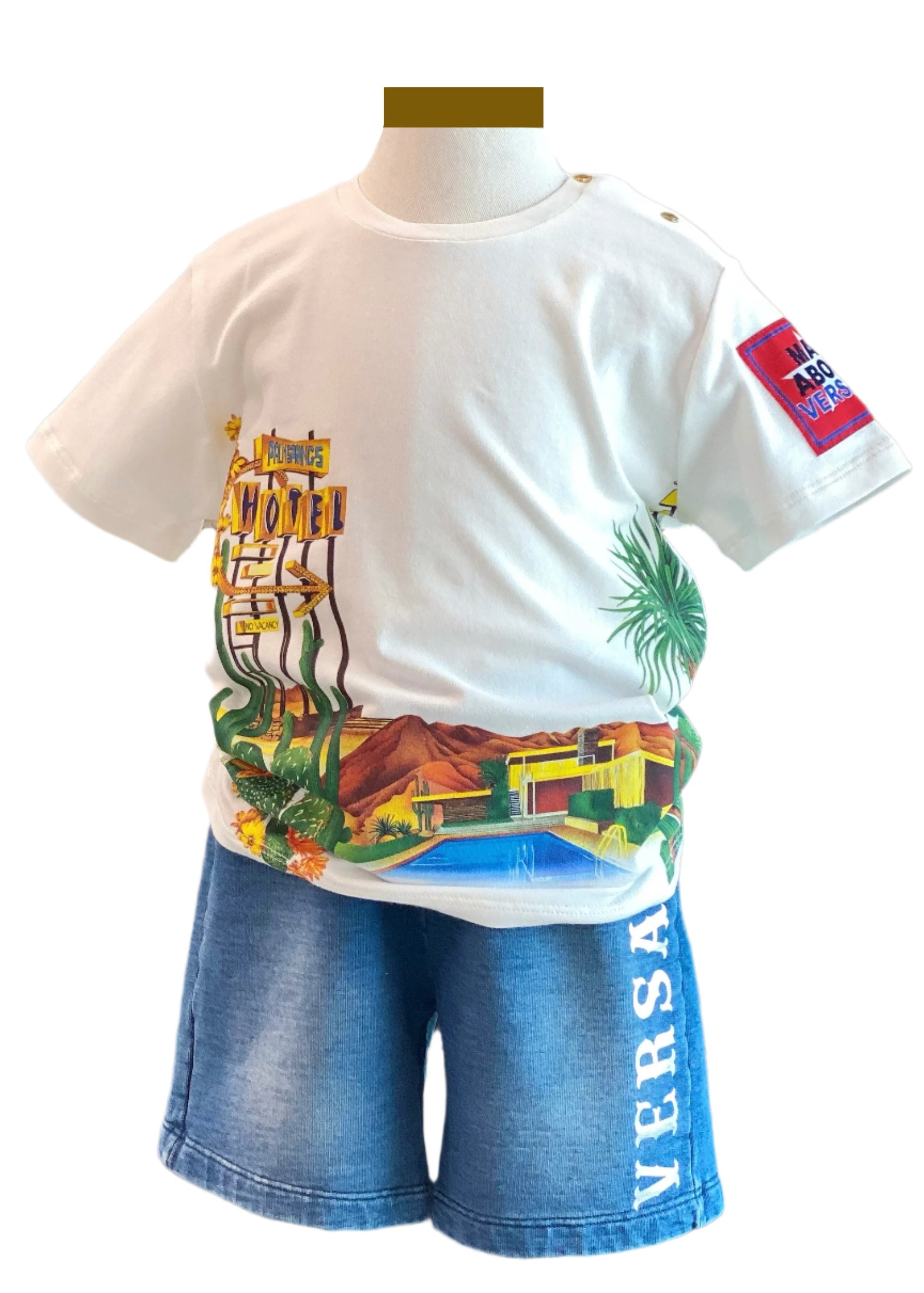 Soft casual boy outfit. This set comes with a short sleeve t-shirt printed with a spring hotel design and a patch detail on the left side. It is perfectly matched with a soft washed style short, elasticated on the waist, has single pocket at the back, finished with 'VERSACE' writing on one side.