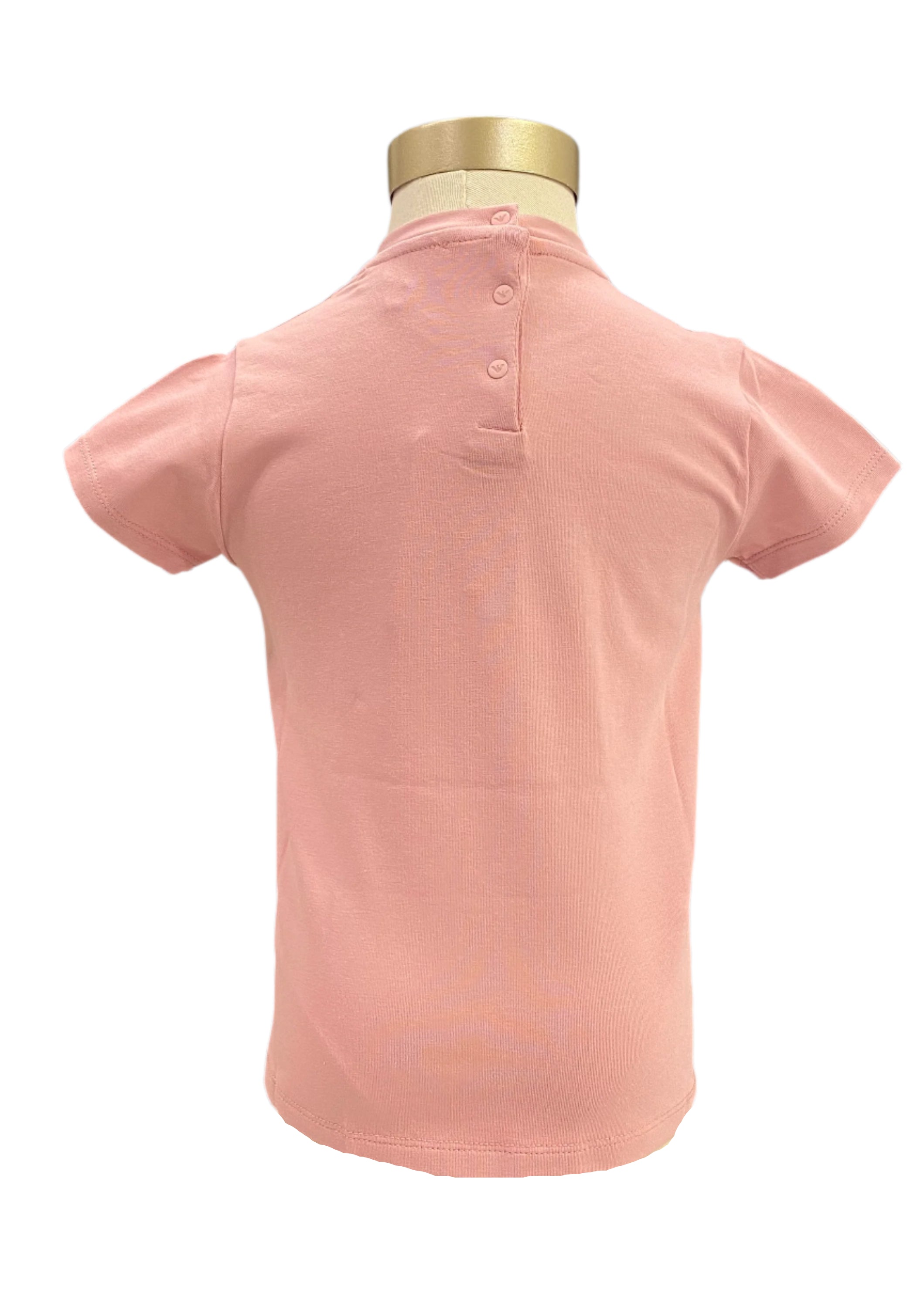 T-shirt in pink, with a large 'Emporio Armani' eagle logo printed on the front. It has short sleeves and a narrow ribbing in the neck opening. Also has a snap fastening branded button.
