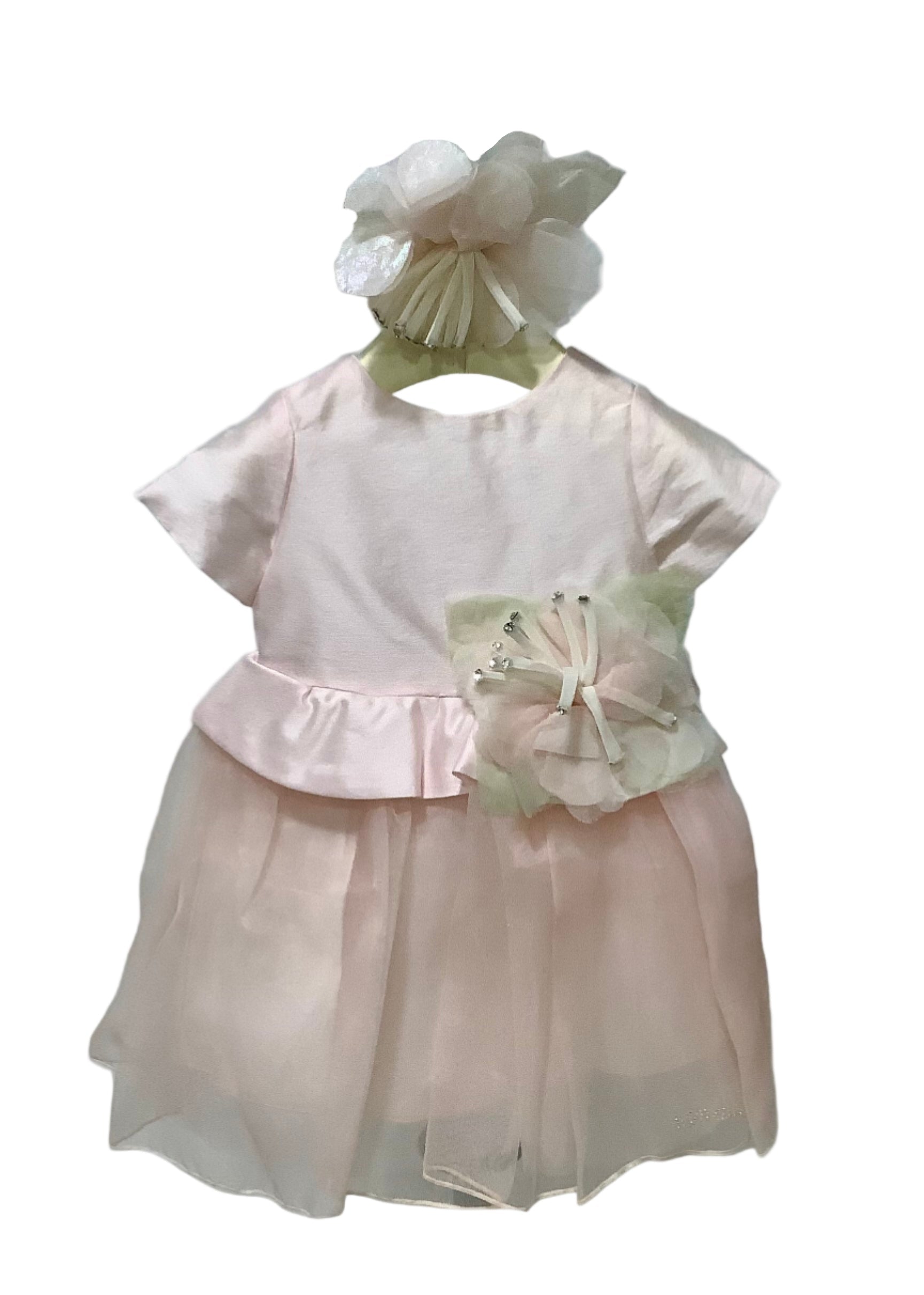 Elegant baby girl pink dress. Soft silk fabric on chest and tulle skirt, designed with floral applique, round neck and zip fastening at the back. Small size dress comes with a matching hairband.